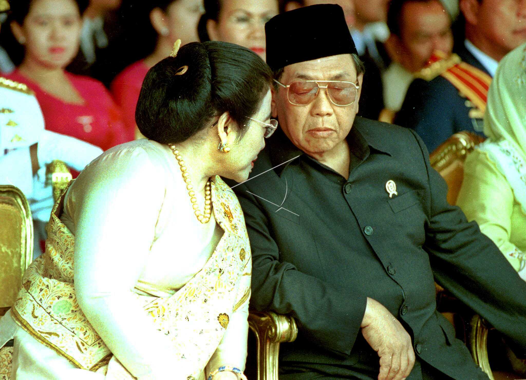 President Abdurrahman Wahid talks with Vice President Megawati Soekarnoputri while attending the commemoration of the 55th TNI Anniversary at TNI Headquarters, Cilangkap, Jakarta, October 5, 2000. ANTARA FOTO/Ali Anwar/asf/tom/sa.