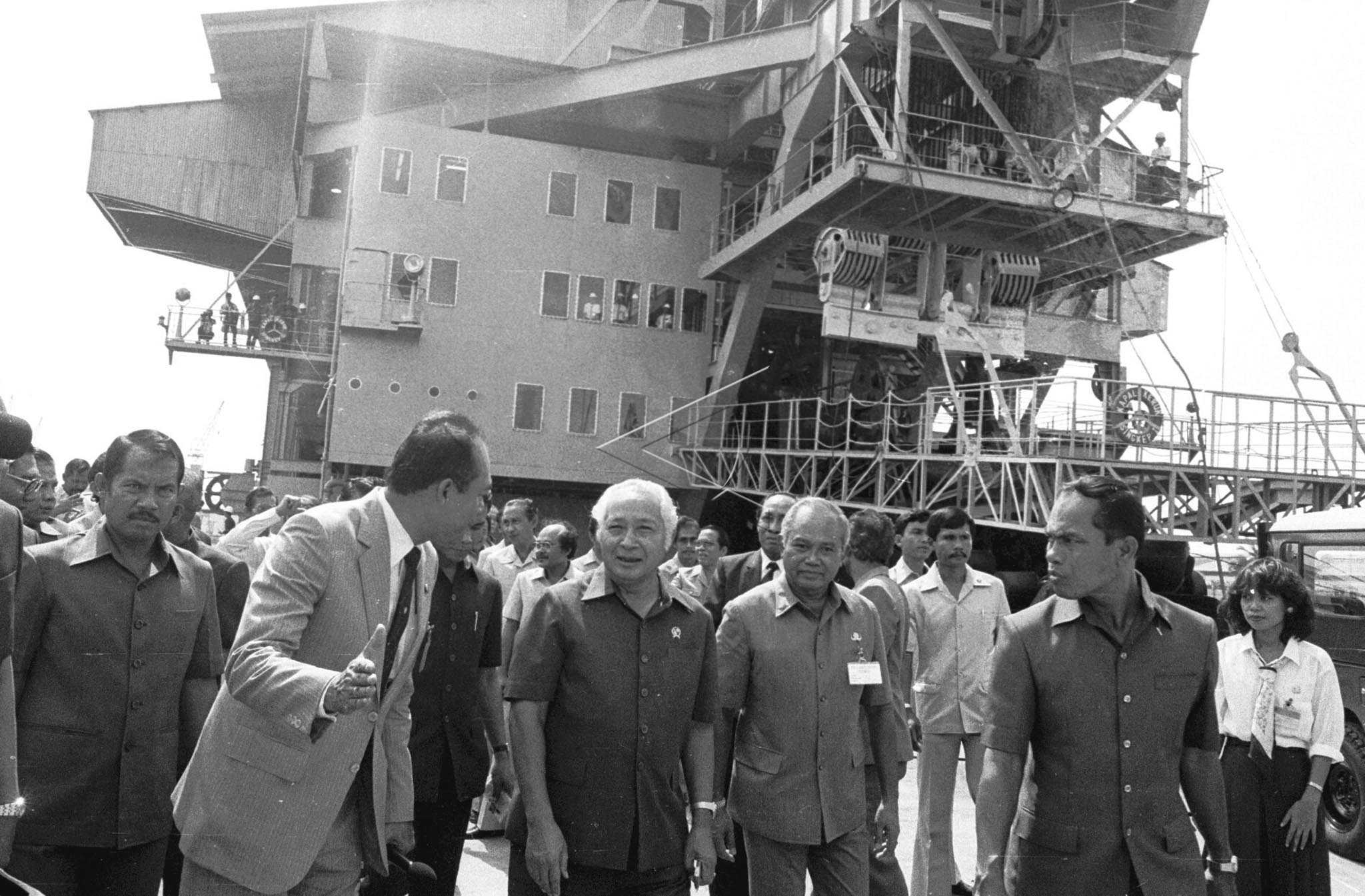 President Soeharto (center) walks with President Director of PT Koja Soeparno P (second left) and President Director of PT Timah Soedjatmiko (right) after inaugurating the operation of Singkep I Dredge built by a consortium of four domestic shipyards at a cost of Rp28 billion on the orders of PT Timah, at shipyard of PT Koja, […]