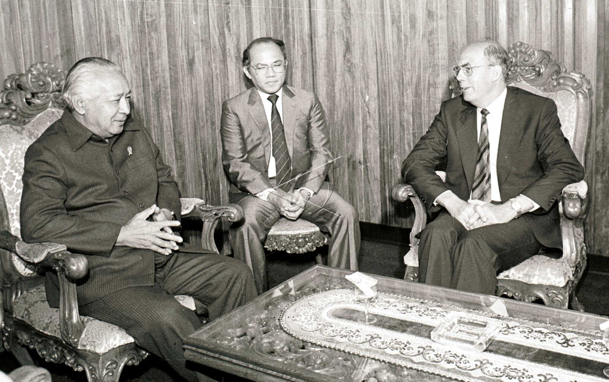 President Soeharto (left) talks with the Dutch Minister of Defense Dr. J. De Ruiter during a series of meetings with his three-day visit in Indonesia, at Bina Graha, Jakarta, April 19, 1986. ANTARA FOTO/N04/N01/RN1/asf/nym/sa.
