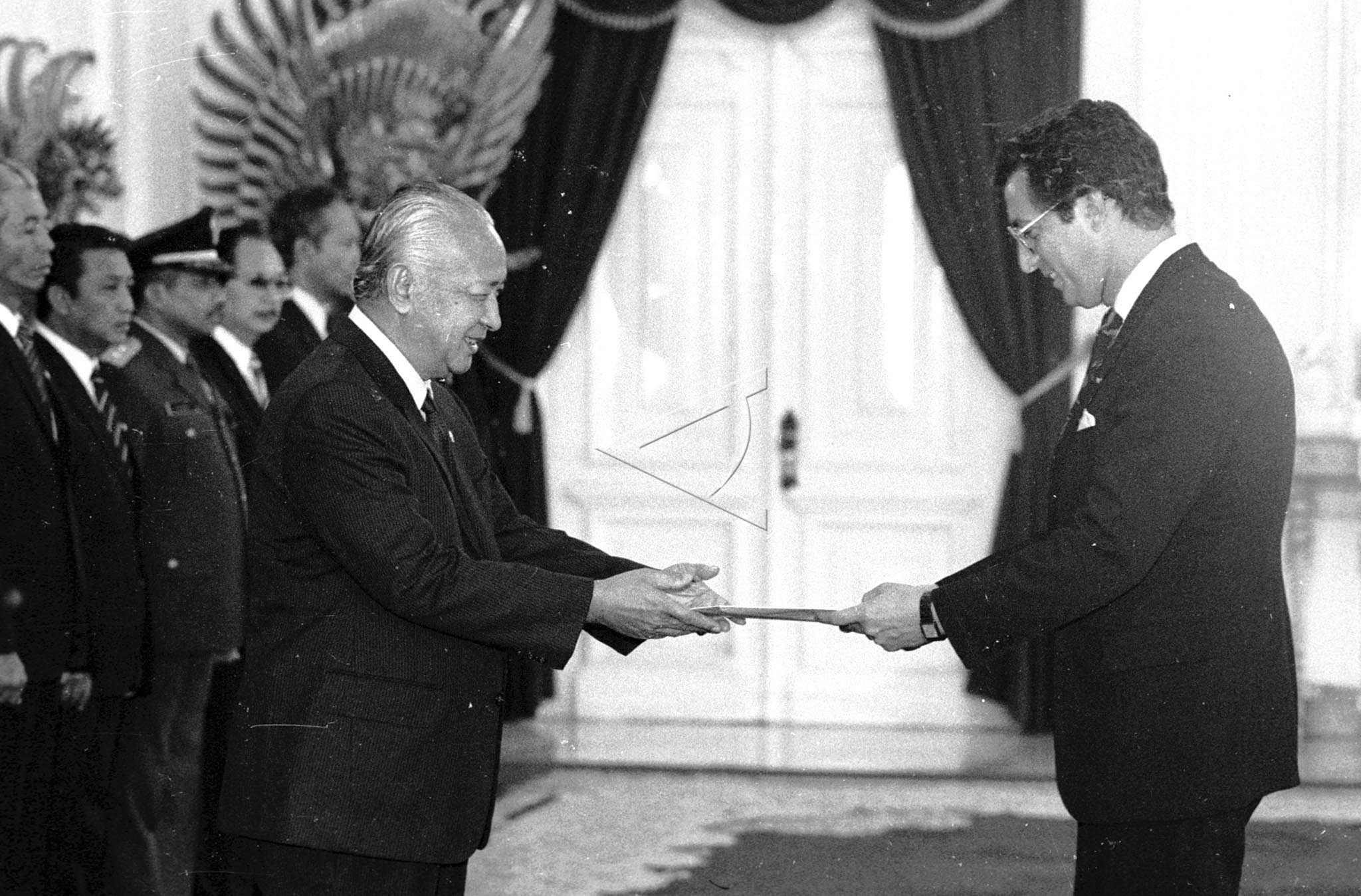 President Soeharto (left) receives a credentials of Tunisian Ambassador Ennaifar Azouz at Merdeka Palace, Jakarta, October 14, 1987. ANTARA FOTO/N04/RN1/hm/asf/nym/sa.