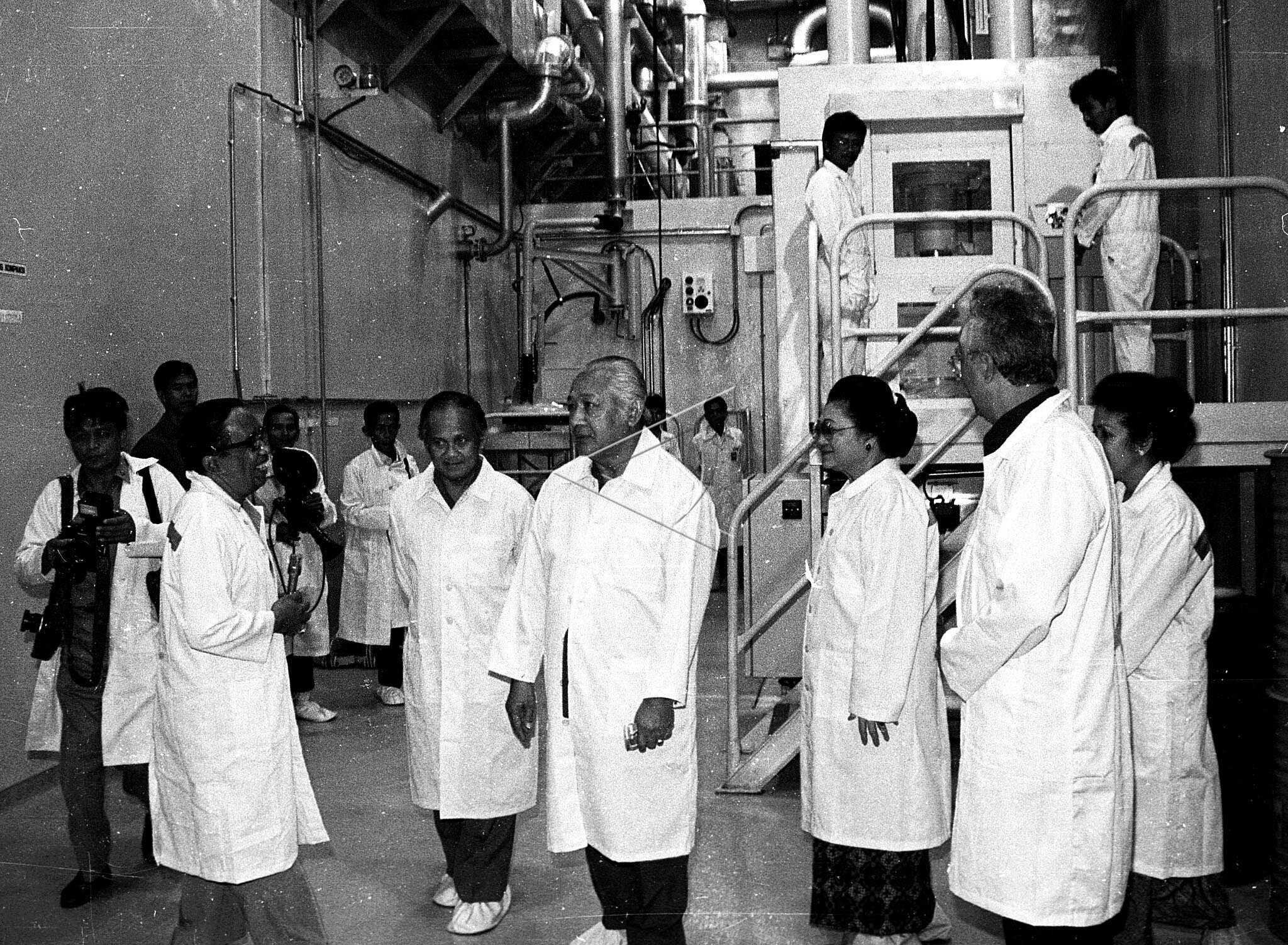 President Soeharto (fourth right) with First Lady Tien Soeharto (third right), Minister of Technology/Chairman of BPPT Prof. Dr. Ing. BJ. Habibie (third left) reviews a solid waste press to be smaller after inaugurating the Radioactive Waste Treatment Plant (IPLR) Serpong, Tangerang, West Java, December 5, 1988. ANTARA FOTO/N03/hp/asf/nym/sa.