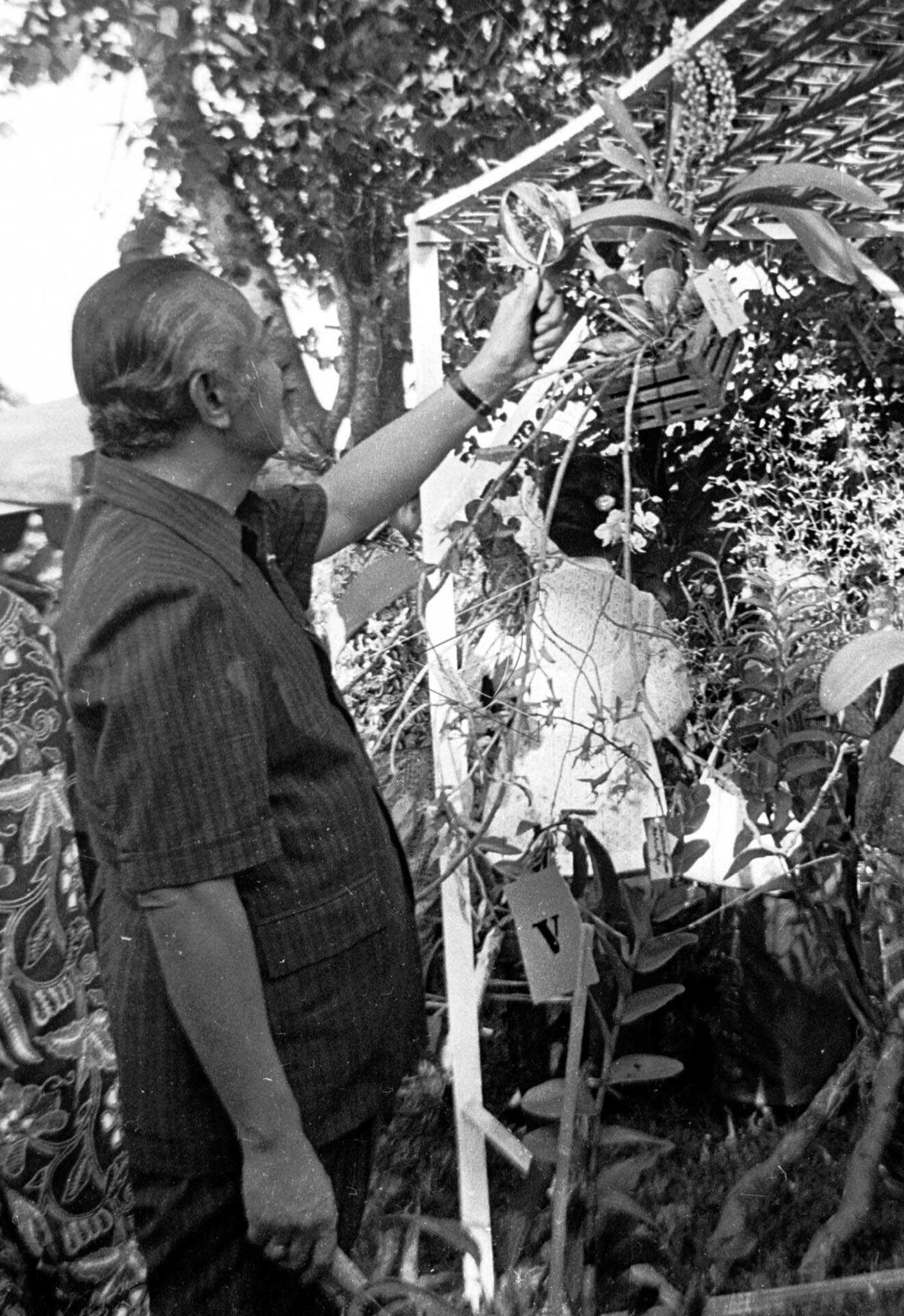 President Soeharto enjoy the beauty of the Maluku’s Orchid (Dendrobium bigibbum) with a magnifier during the orchid and traditional handicrafts fair in Ambon, Maluku, November 1978. ANTARA FOTO/Makiwawu/hm/asf/nym.