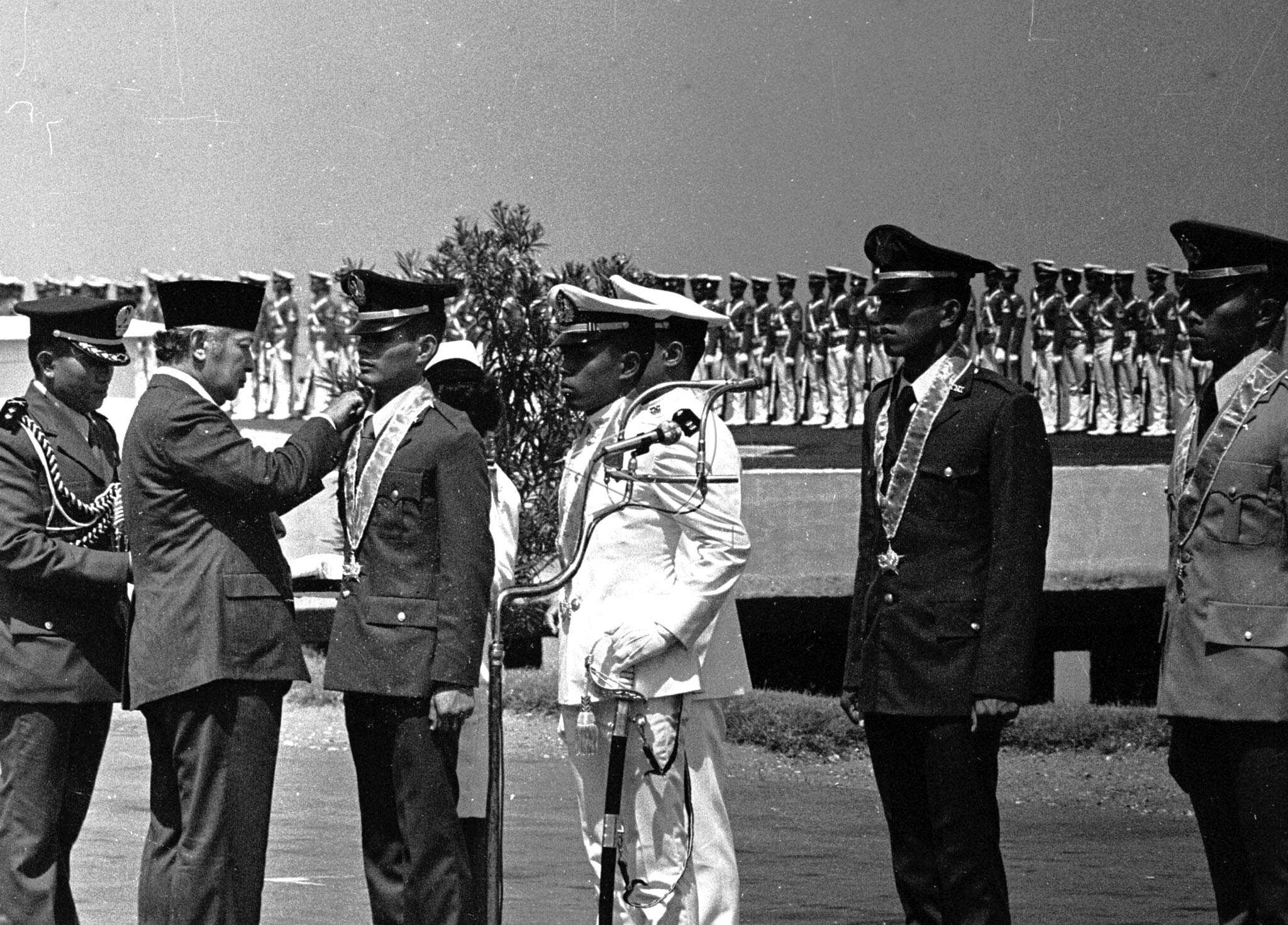 President Soeharto (second left) pin in the Adhi Makayasa badge to four officers who graduated with best marks from the Indonesian Military Academy year 1978 during the Prasetya Perwira ceremony at the Navy Pier, Ujung, Surabaya, East Java, December 1978. ANTARA FOTO/Surabaya/hm/asf/nym.