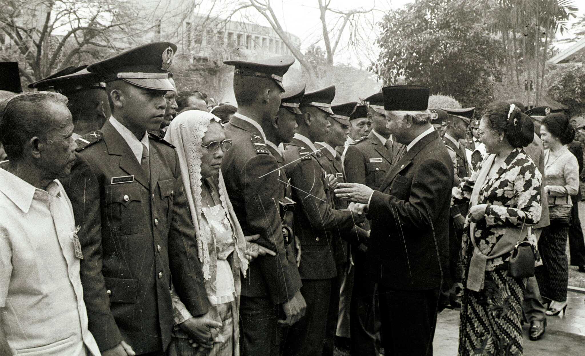 President Soeharto (second right) accompanied by The First Lady Mrs. Tien Soeharto congratulated young officers at the Prasetya Perwira (Praspa) ceremony who appointed 548 young officers who graduated from the 1986 Akabri Military Academy at the Merdeka Palace, Jakarta, Saturday (20/9). ANTARA FOTO/N04/RN1/asf/yu/sa.