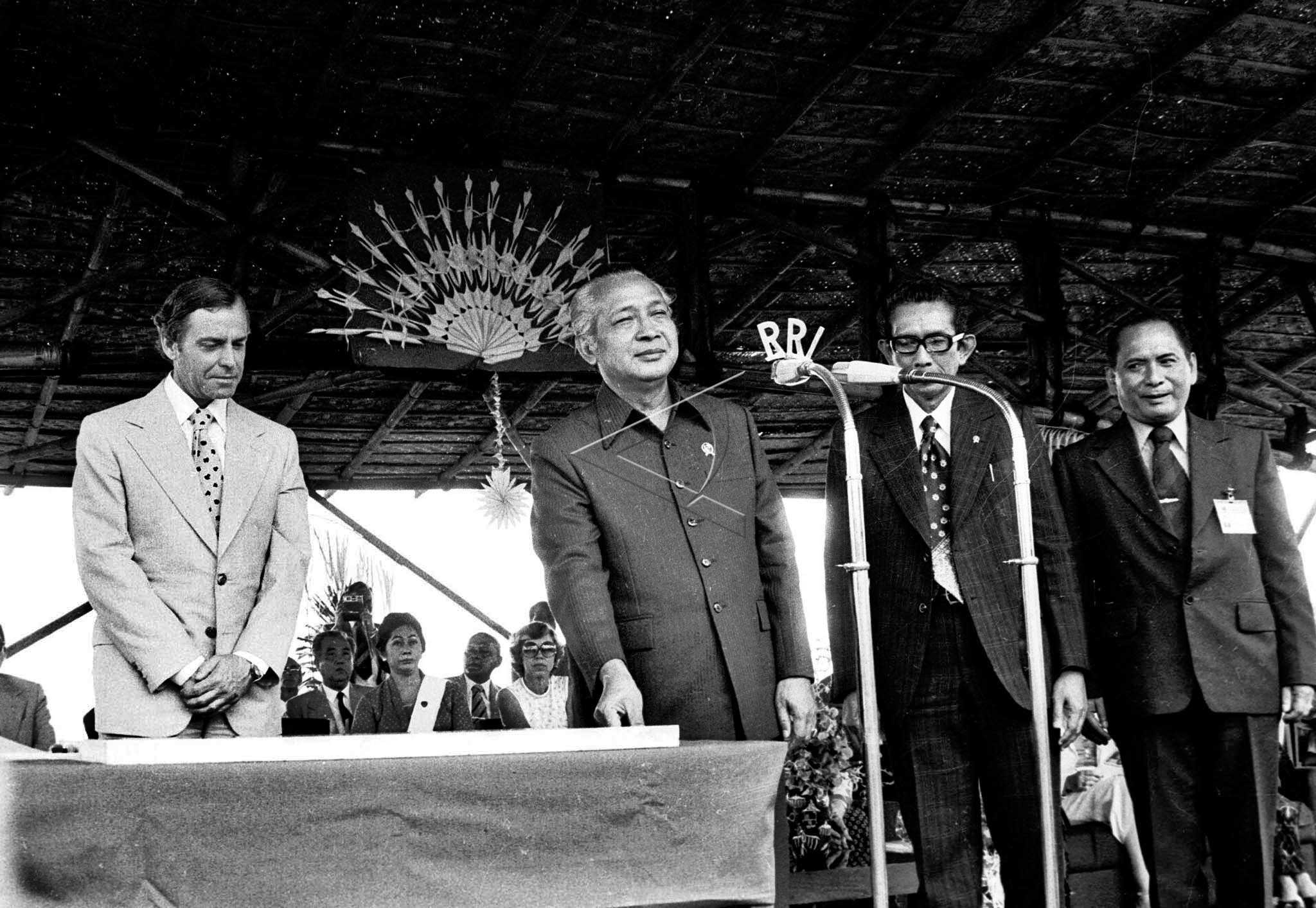 President Soeharto (3rd right) pushes a button to inaugurate of Bogor Livestock Research and Development Center (P3TB) in Ciawi, Bogor, West Java (1978). ANTARA FOTO/Rachman/hm/asf/tom.