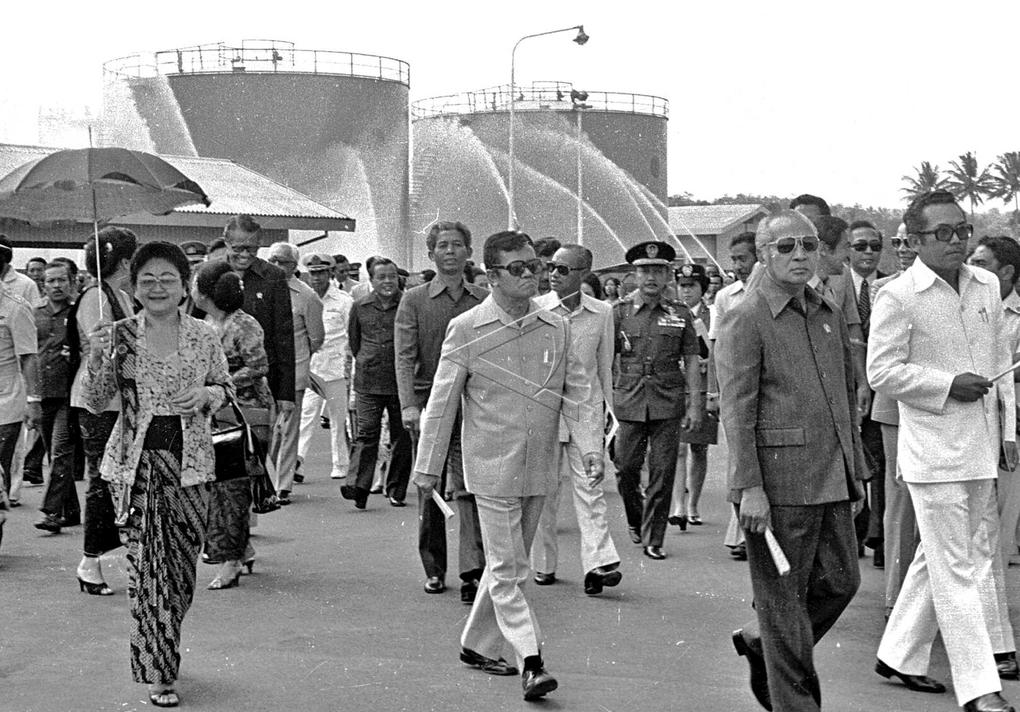 President Soeharto (2nd right) and First Lady Tien Soeharto (left) visit Pertamina fuel depot with a capacity of 60,500 kiloliters during the inauguration in Padalarang, West Java, July 11, 1979. ANTARA FOTO/F/hm/asf/tom.