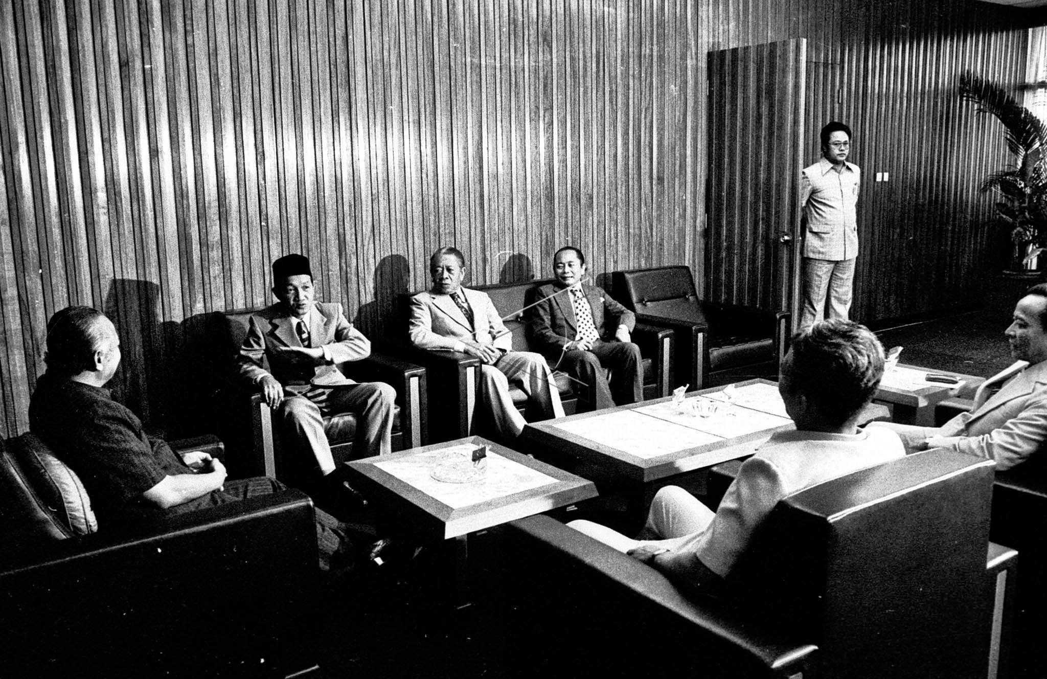 President Soeharto meets members of Supreme Advisory Council (DPA) Idham Chalid, Sunawar Sukawati, Soejono, J. Naro, and General Secretary of DPA Piet Wirjawan at Bina Graha in Jakarta, 1979. ANTARA FOTO/Rachman/hm/asf/tom.