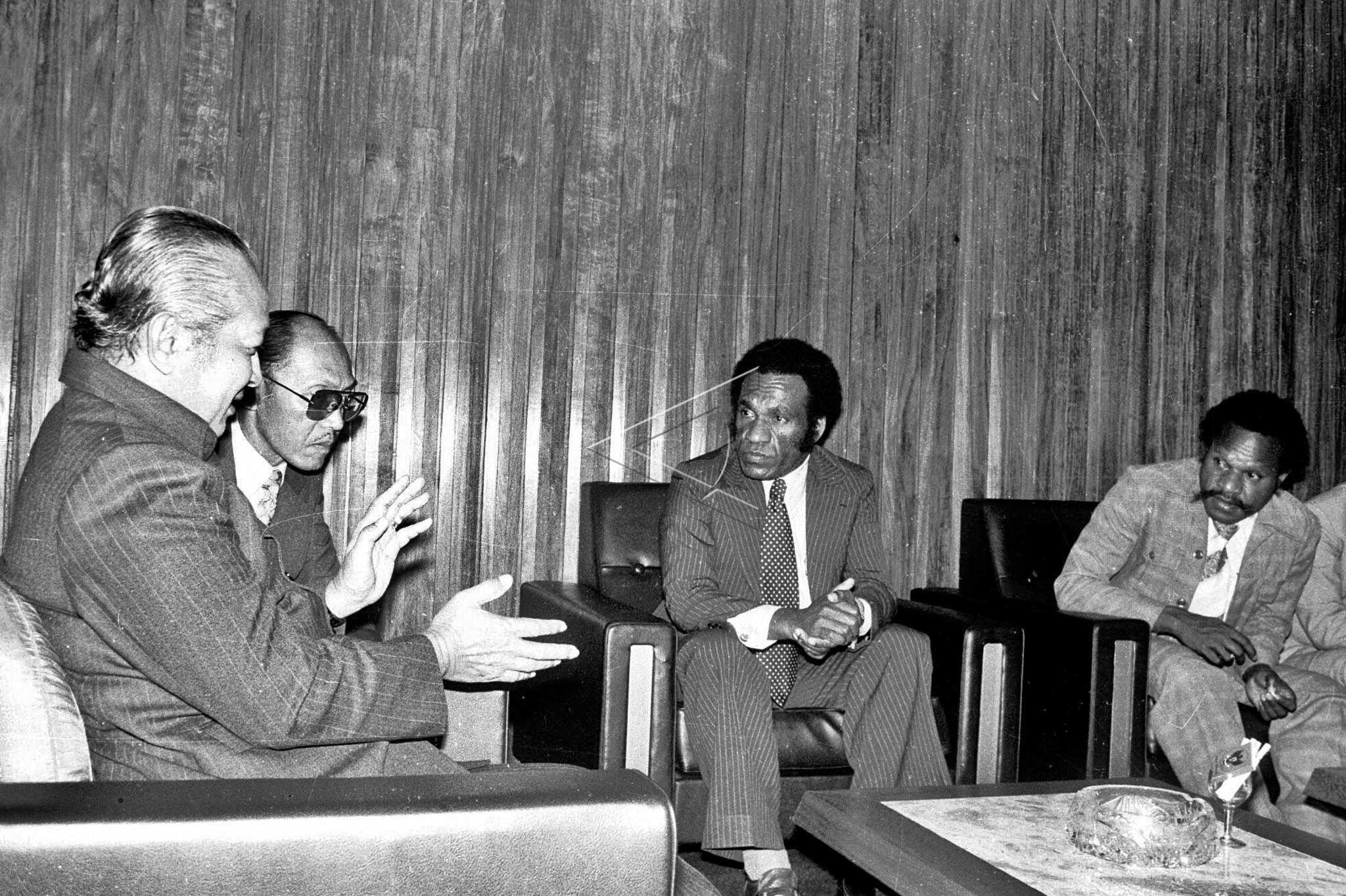 President Soeharto (left) meets Papua New Guinea opposition leader Iambakey Okuk and groups at Bina Graha in Jakarta (1978). ANTARA FOTO/Rachman/hm/asf/tom.