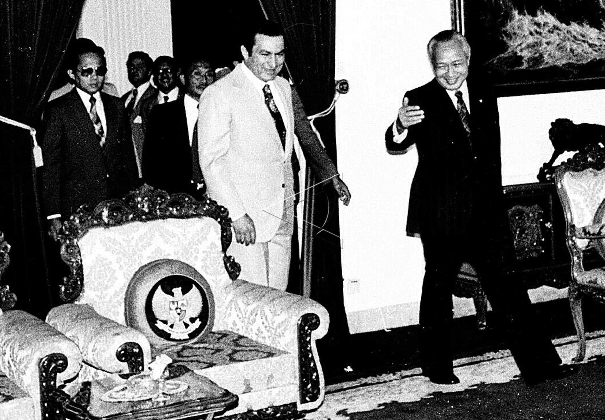 President Soeharto (right) meets Vice President of Egypt Hosni Mobarak (2nd right) at the State Palace in Jakarta, April 28, 1979. ANTARA FOTO/AR/Koz/hp/asf/tom.