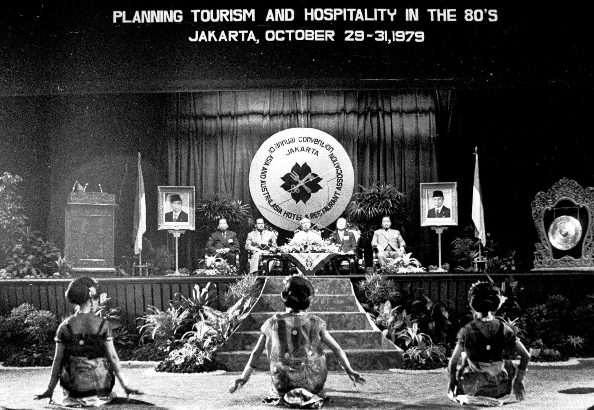 President Soeharto (center) accompanied by Sukamdani Sahid Gitosardjono (left), Minister of Transportation Rusmin Nuryadin (left), President AAHRA S.C. Huang (2nd right) and Gatot Soehendar (right) watch a welcome dance during the opening of 10th Asian-Australia Hotels and Restaurants Association (AAHRA) Conference at Hotel Indonesia Sheraton in Jakarta, October 29, 1979. ANTARA FOTO/AR/hm/asf/tom.