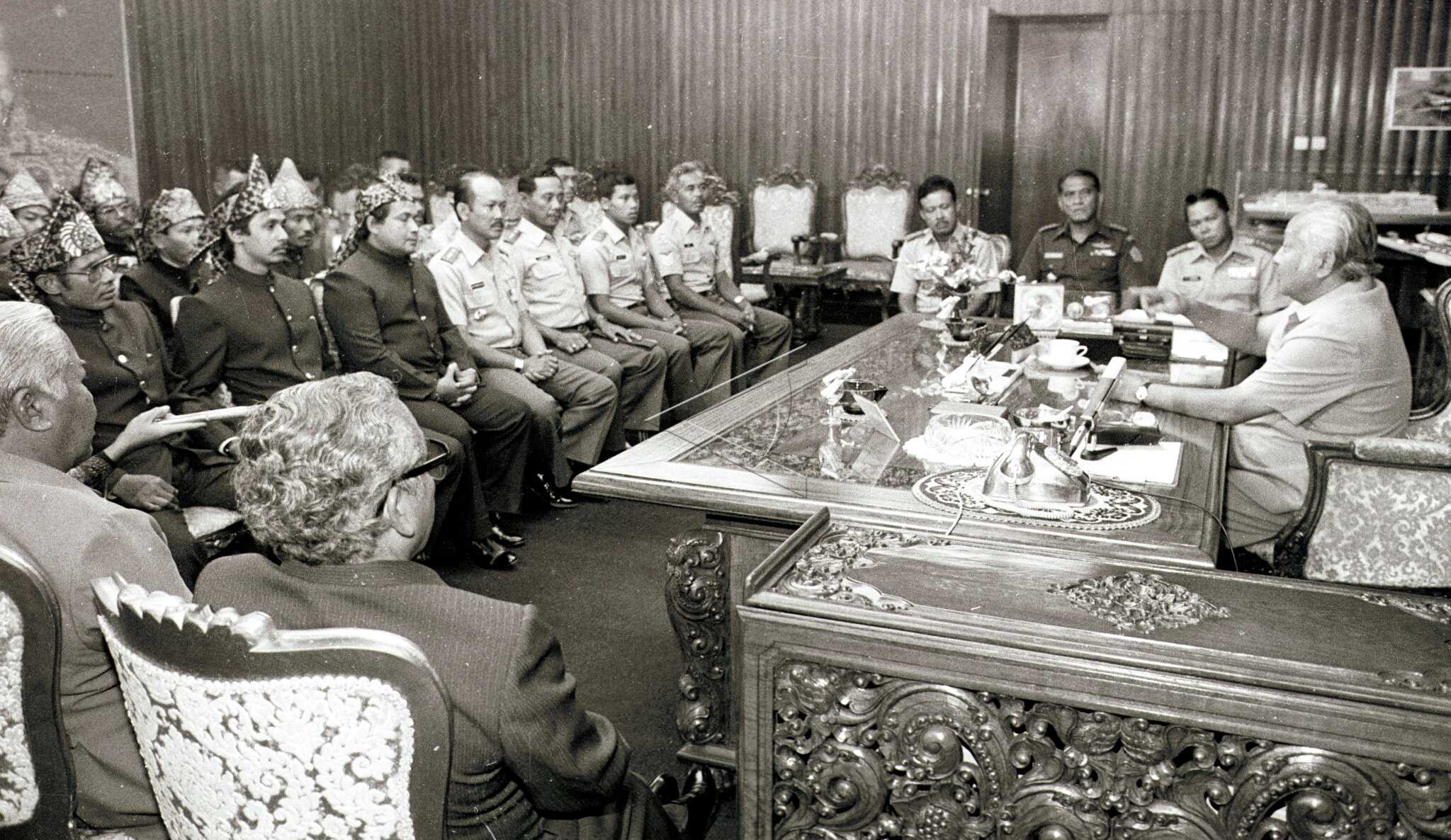 President Soeharto (right) received the crew of the Nusantara Phinisi and the Indonesian Navy Training Ship KRI Dewaruci who were taken over by Gita Ardjakusumah and Commander Lieutenant Colonel Ripa Gamhadi after sailing as national ambassadors to several countries in the world at Bina Graha Jakarta, October 25, 1986. ANTARA FOTO/N04/asf/yu/sa.