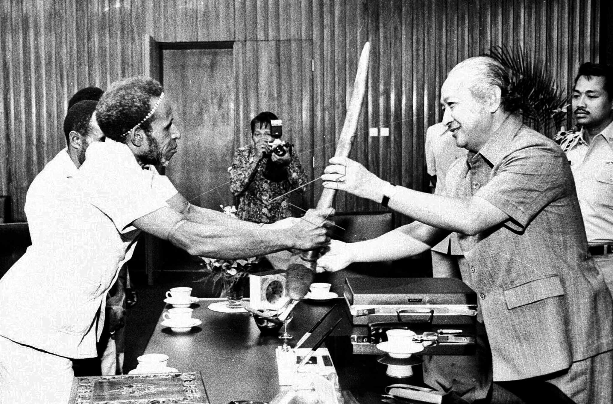 President Soeharto receives a stone ax from the Chief of Malino Tribe/Siep Kosi Obahorok at Bina Graha in Jakarta, May 21, 1979. ANTARA FOTO/Rachman/hm/asf/tom.