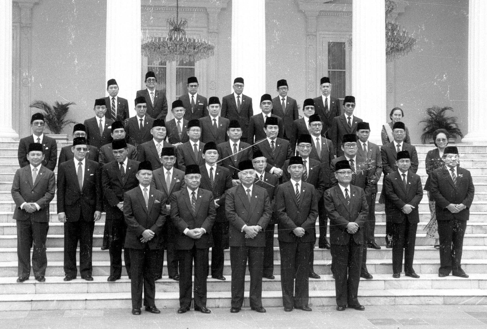 President Soeharto (front center) and Vice President Soedharmono, SH (both front right) posing with the ministers of the V Development Cabinet after the inauguration and swearing-in of the Merdeka Palace, March 23, 1988. ANTARA FOTO/N04/RN1/asf/yu/sa.