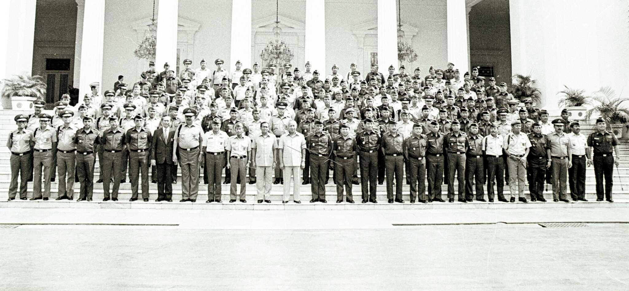 President Soeharto (center) poses with ABRI (indonesian army) leadership meeting participants in front of the State Palace in Jakarta, September 30, 1983. ANTARA FOTO/P05/asf/yu/sa