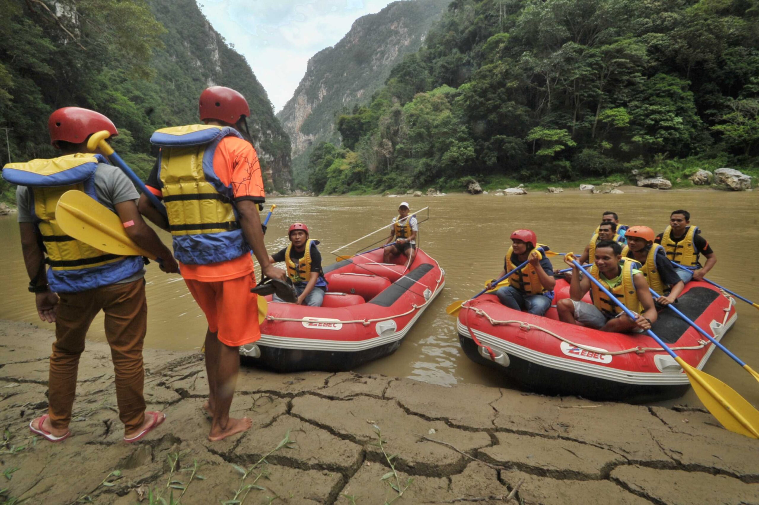 Tourists board rubber boats before a rafting tour at Batang Kuantan River in Nagari Silokek, Sijunjung, West Sumatra, February 18, 2017. ANTARA FOTO/Iggoy el Fitra/dw/tom