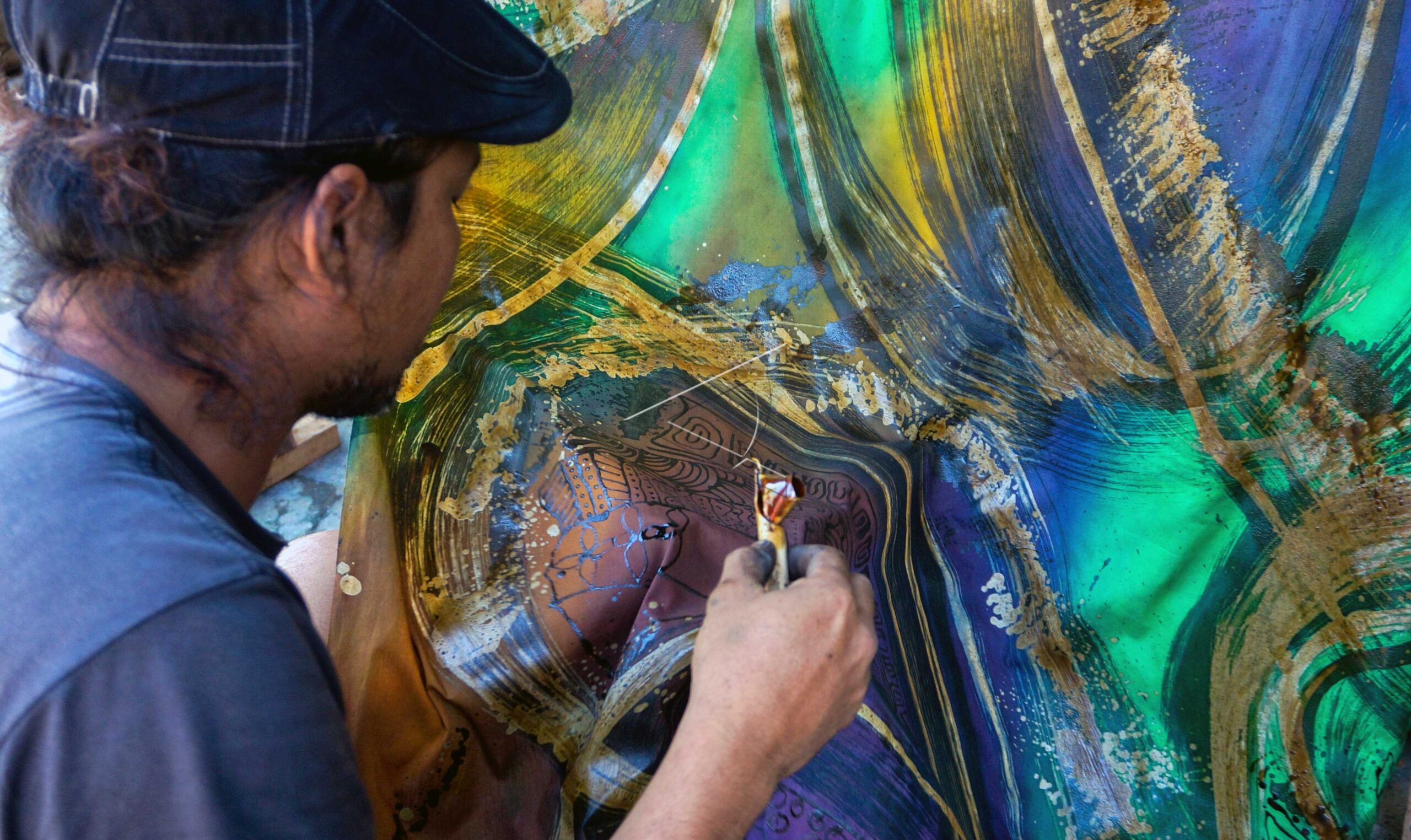 A craftsman casts batik cloth with realist patterns which will be marketed online, in Pekalongan, Central Java, June 26, 2019. ANTARA FOTO/Harviyan Perdana Putra/dw/tom/sa.