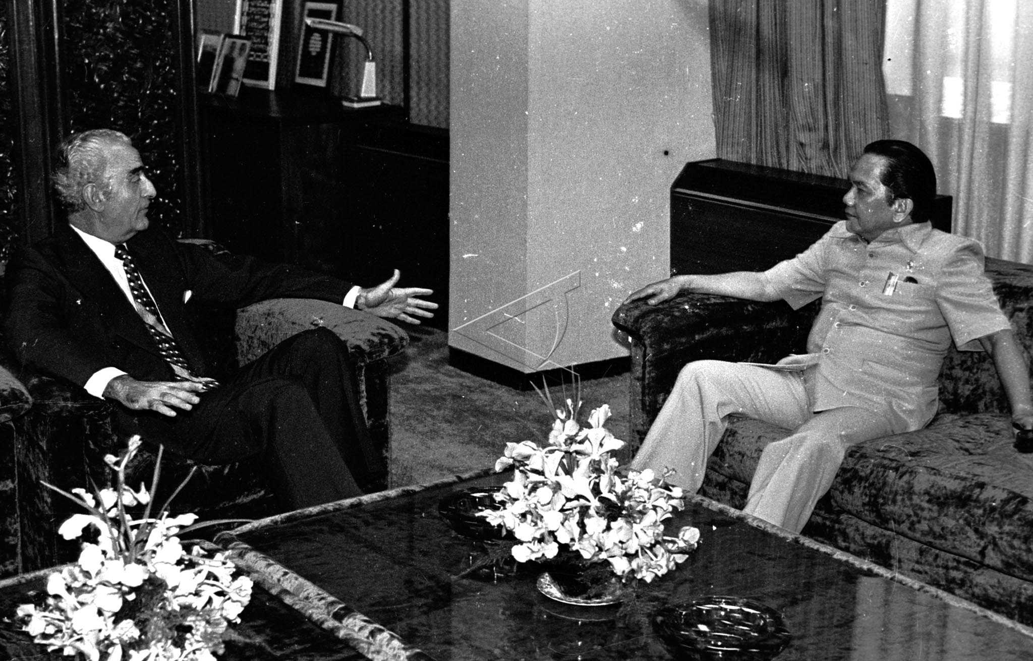 Religion Minister Alamsyah Ratu Perwiranegara (R) talks to newly appointed Argentina Ambassador to Indonesia Mario Pepe, in Jakarta, October 30, 1979. ANTARA FOTO/Mawardi Muis/hm/asf/nym.