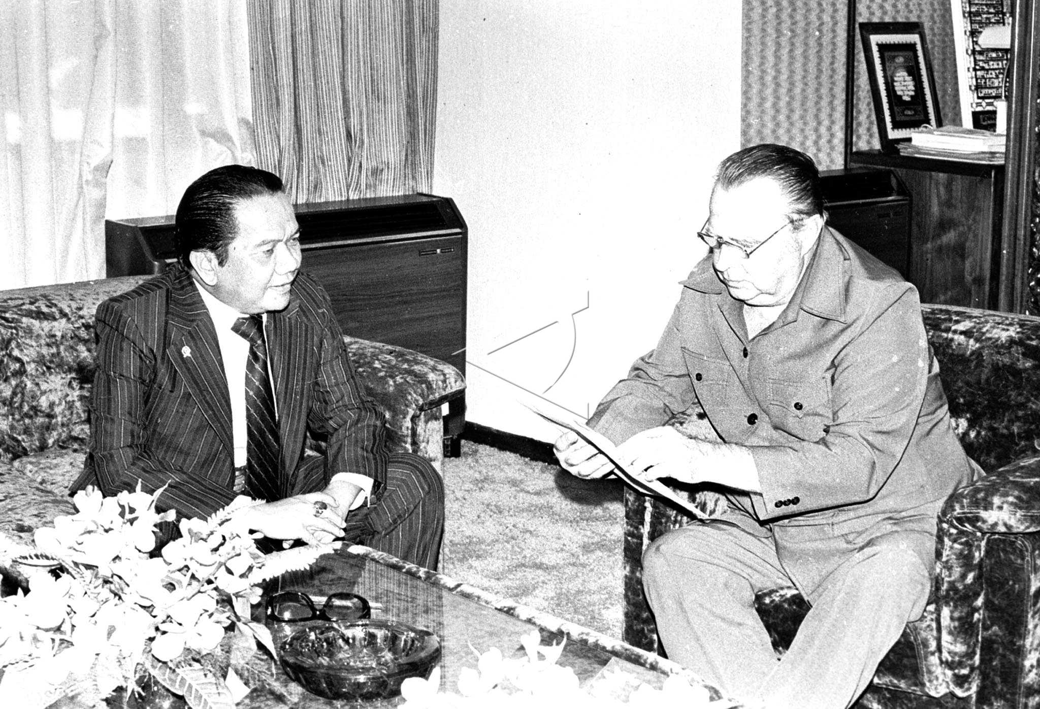 Religion Minister Alamsyah Ratu Perwiranegara (L) talks to Russia’s Ambassador for Indonesia, Ivan Fadeevich Shpedko during his visit to the Ministry of Religious Affairs, in Jakarta, July 19, 1979. ANTARA FOTO/Mawardi Muis/hm/asf/nym.