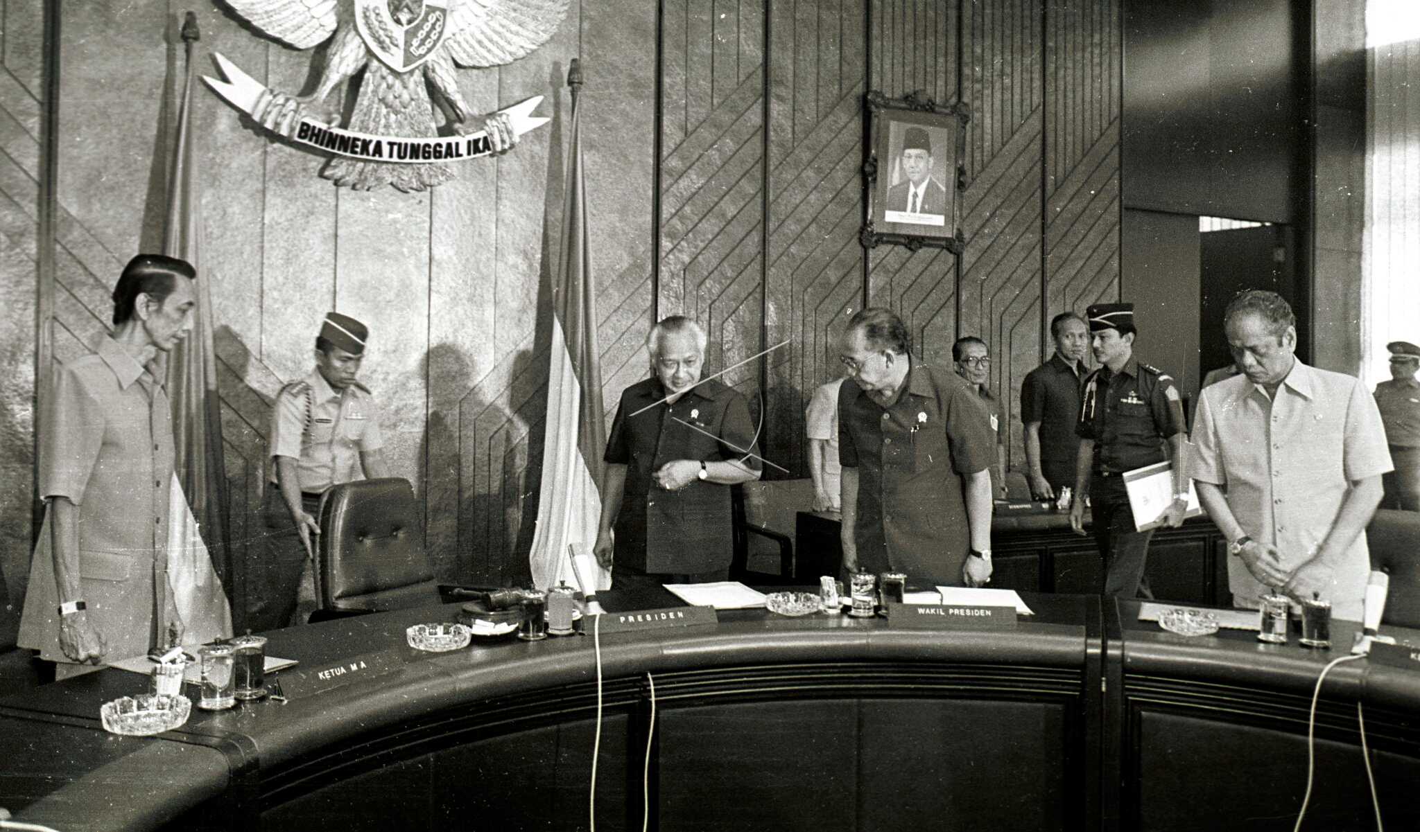 President Soeharto (center) leads the Plenary Cabinet Session to discuss the government’s policy in devaluing Rupiah against the US dollar by 45 percent which was announced on the evening of September 9, at State Secretariat Building, Jakarta, September 13, 1986. ANTARA FOTO/N04/RN1/asf/nym/sa.