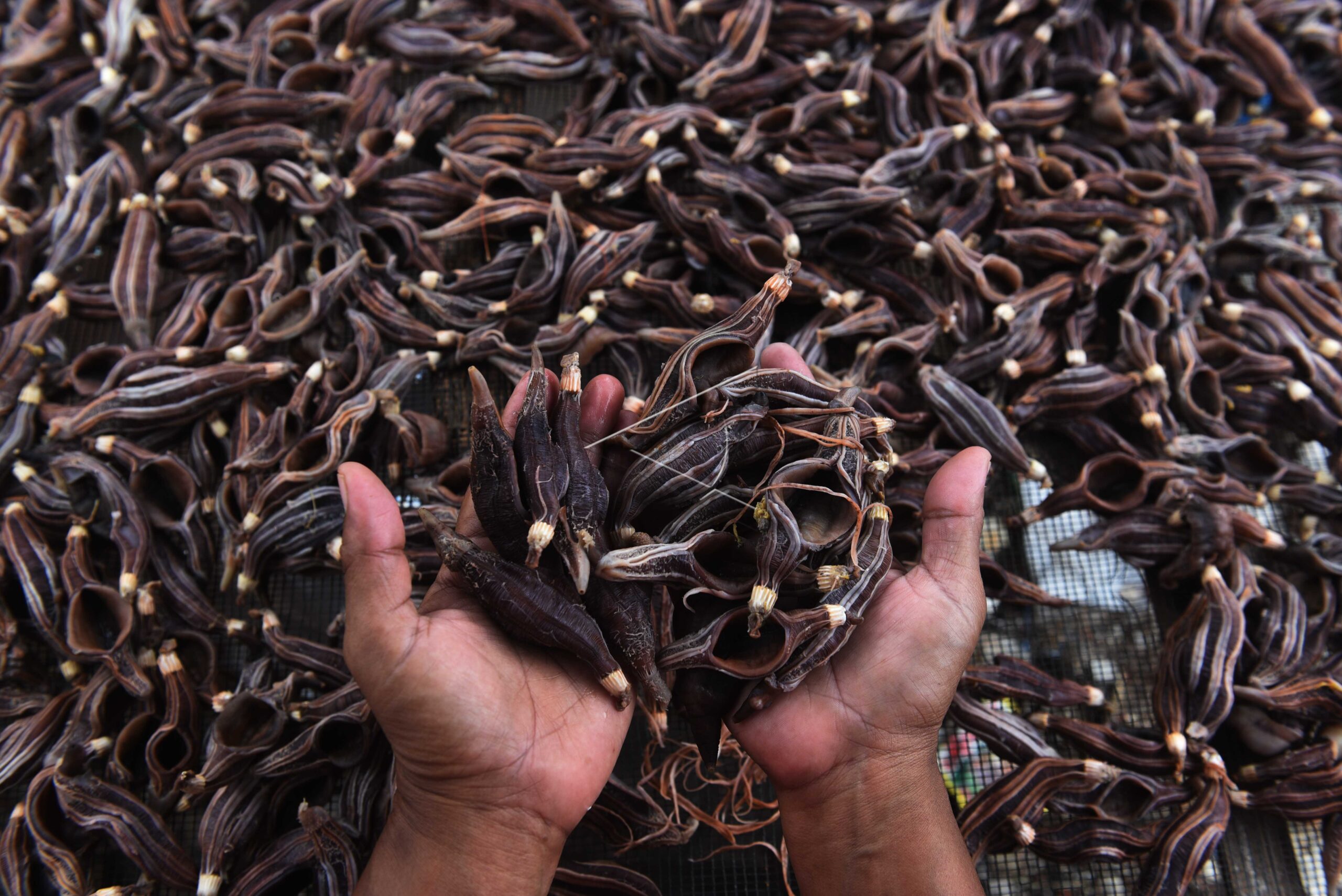People shows dried sea cucumbers in Kenjeran Fisherman Village in Surabaya, East Java, February 28, 2018. ANTARA FOTO/Zabur Karuru/dw/pras.