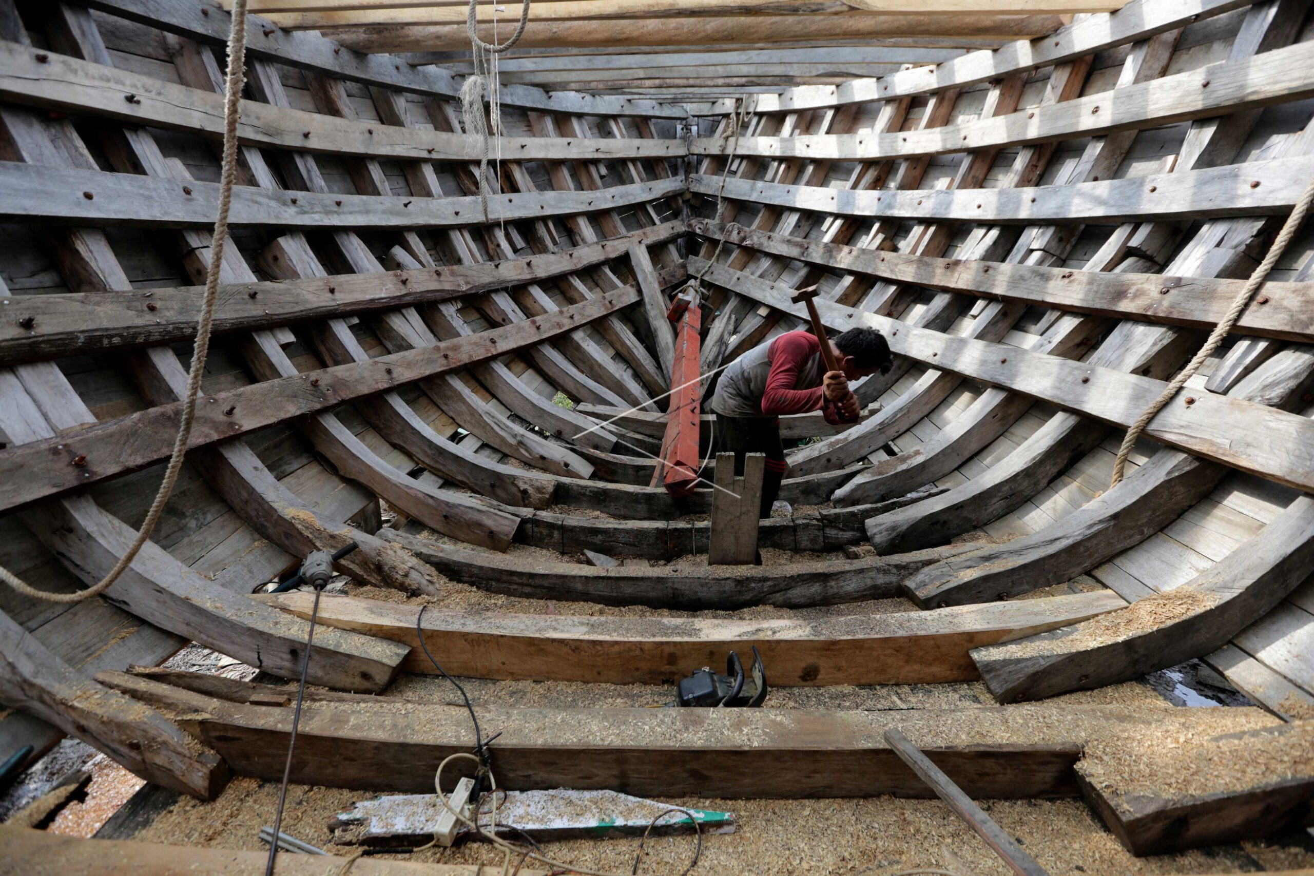 Workers fix fishermen wooden boat in traditional shipyard in Gampong Mulia, Banda Aceh, Aceh, October 17, 2019. ANTARA FOTO/Irwansyah Putra/wsj/dw/nym.