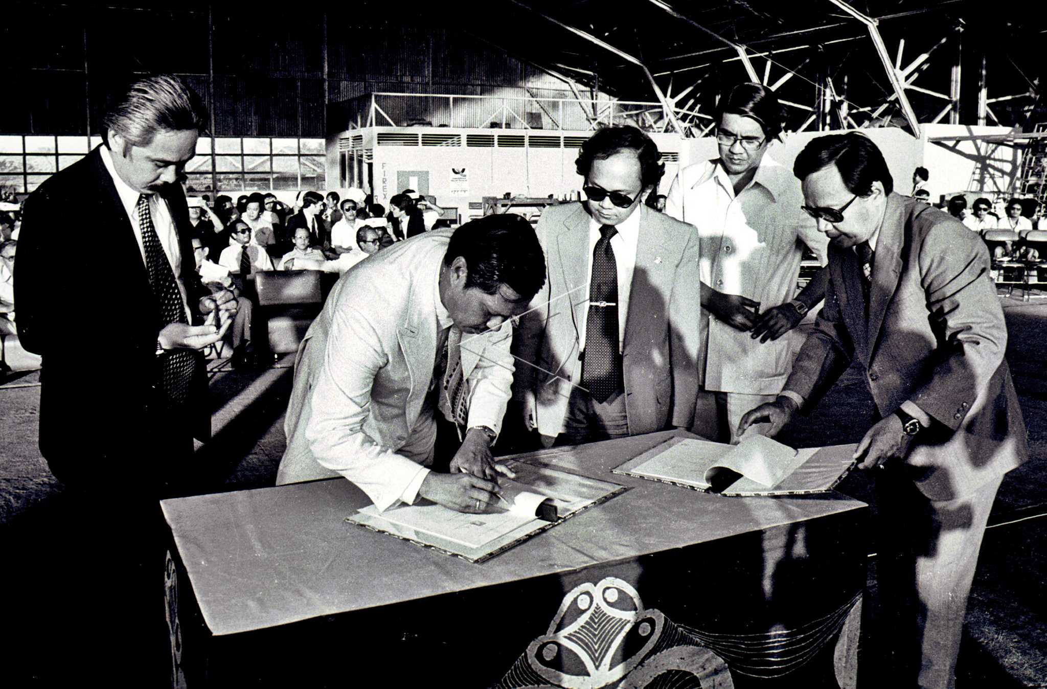 Minister of Research and Technology BJ Habibie who also President Director of PT Nurtanio (3rd right) witness President Director of Bouroq Indonesia Airlines JA Sumendap sign handover paper of three Cassa planes for pioneer flight, in Kemayoran, Jakarta, August 16, 1978. ANTARA FOTO/Ali Anwar/SR/asf/tom.