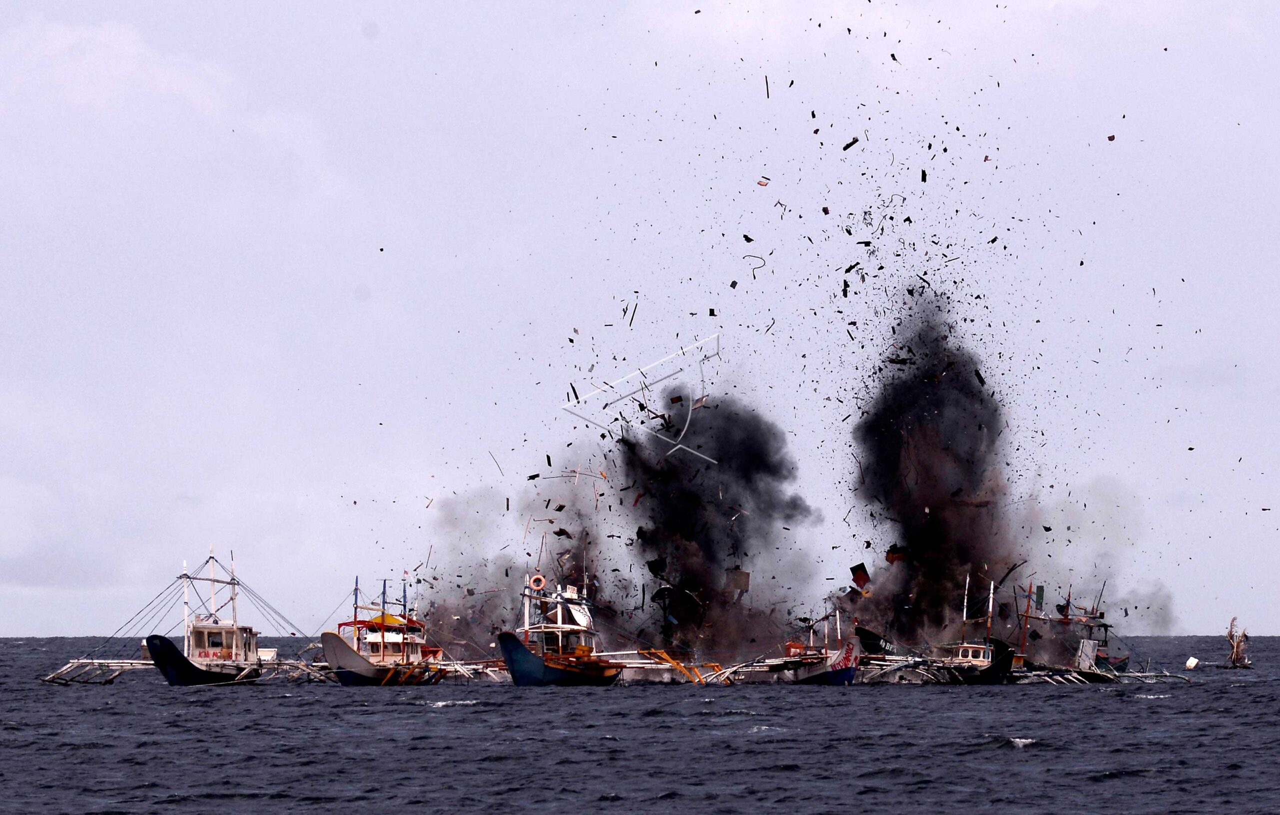 Ship debris scattered into the air during the sinking of illegal fishing vessels in Bitung waters, North Sulawesi, February 22, 2016. ANTARA FOTO/Adwit B Pramono/aww/dw/foc/cfo