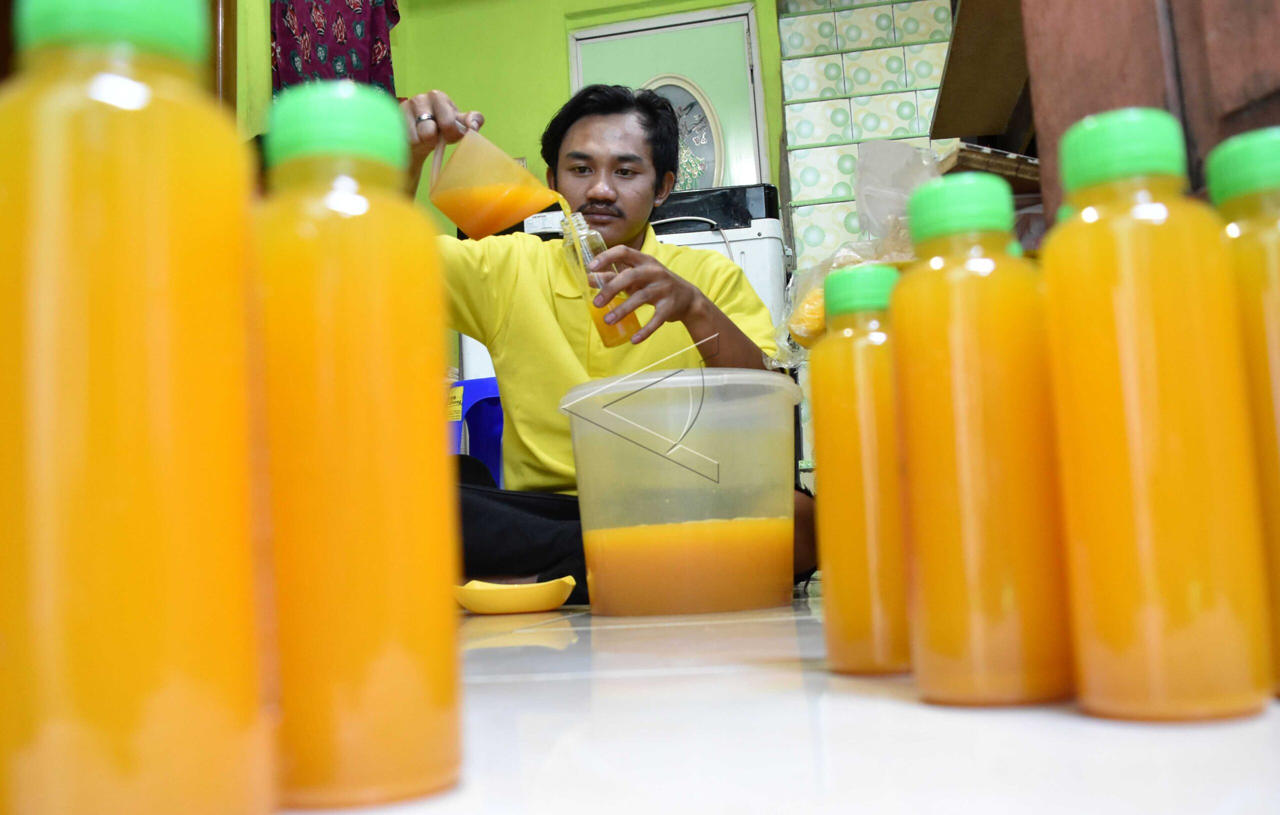 Worker pours sour turmeric drink into a plastic bottle at Gendhis Manes herbal drink production house in Ungaran, Semarang Regency, Central Java, September 25, 2018. ANTARA FOTO/Aditya Pradana Putra/dw/pras.