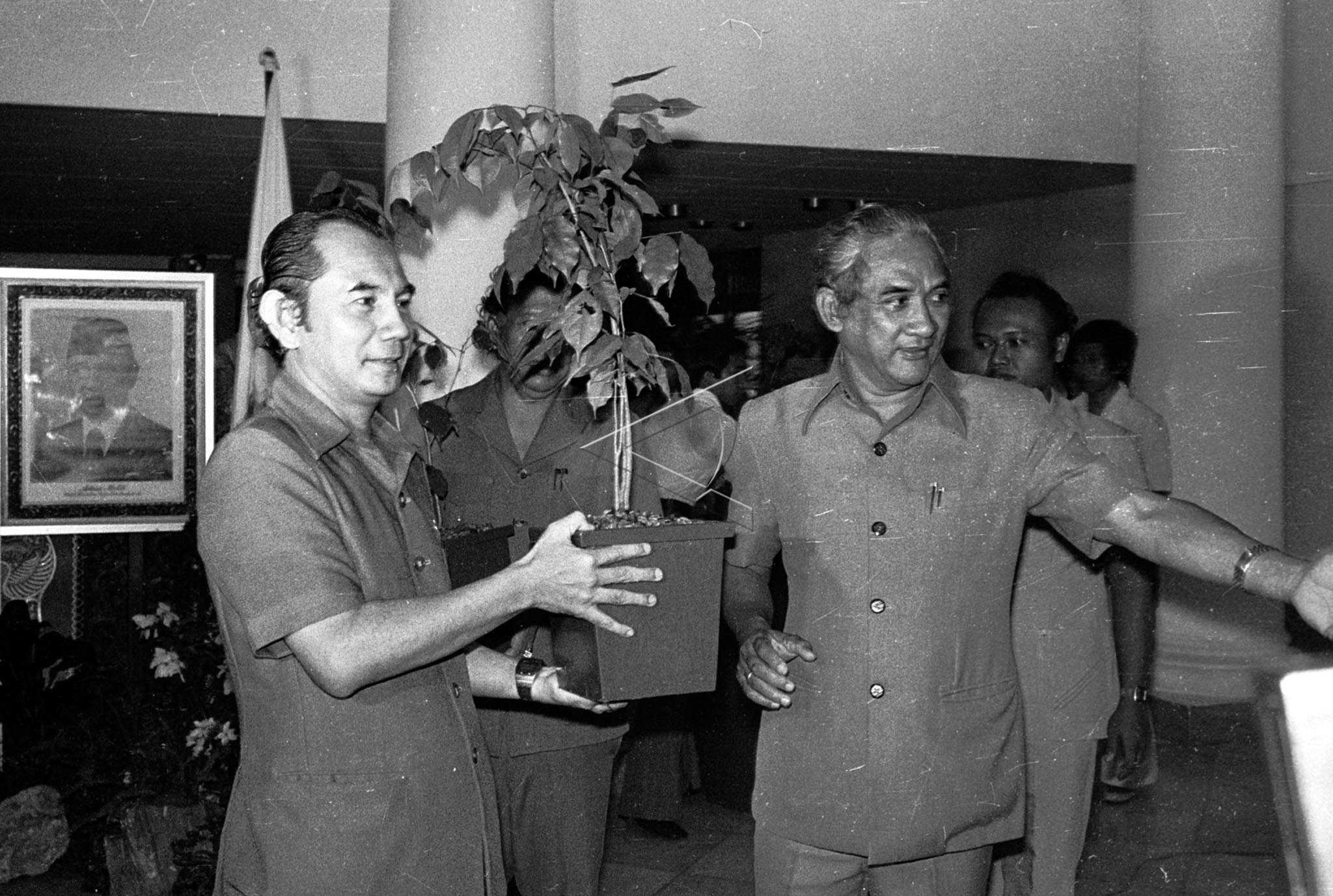 State Minister for Development and Environmental Supervision Prof. Dr. Emil Salim (left) symbolically handed over 2,000 protective trees to DKI Jakarta Governor Tjokropranolo (right) to be forwarded to the youth and students of DKI Jakarta and West Java in increasing environmental awareness, at Jakarta City Hall, November 5, 1979. ANTARA FOTO/Ali Anwar/hm/asf/nym.