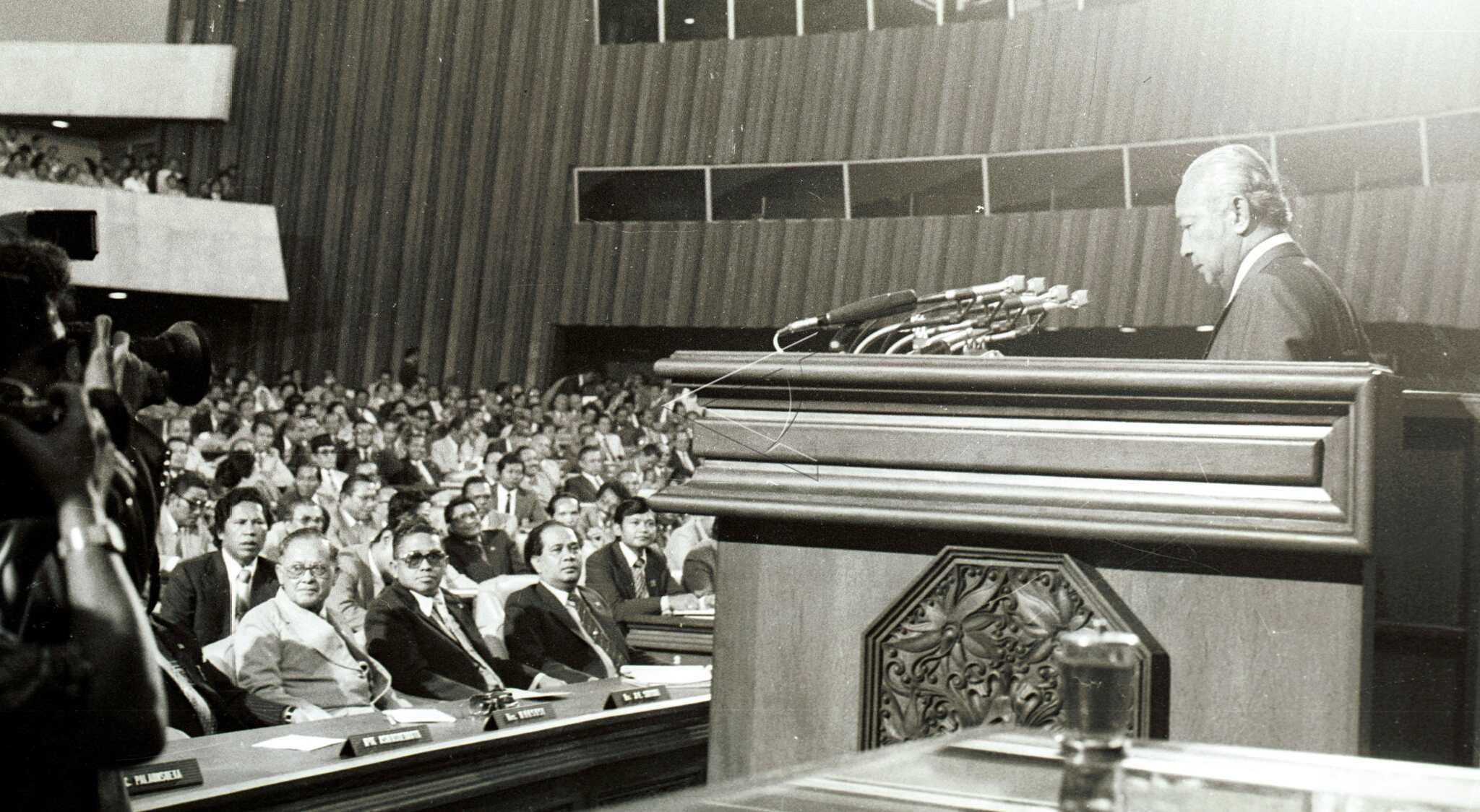 President Soeharto delivere a state speech at DPR-RI Open Plenary Session at the opening of DPR-RI’s First Session Period in Session Year 1983-1984 at DPR RI Building, Jakarta, August 16, 1983. ANTARA FOTO/P06/asf/nym/sa.