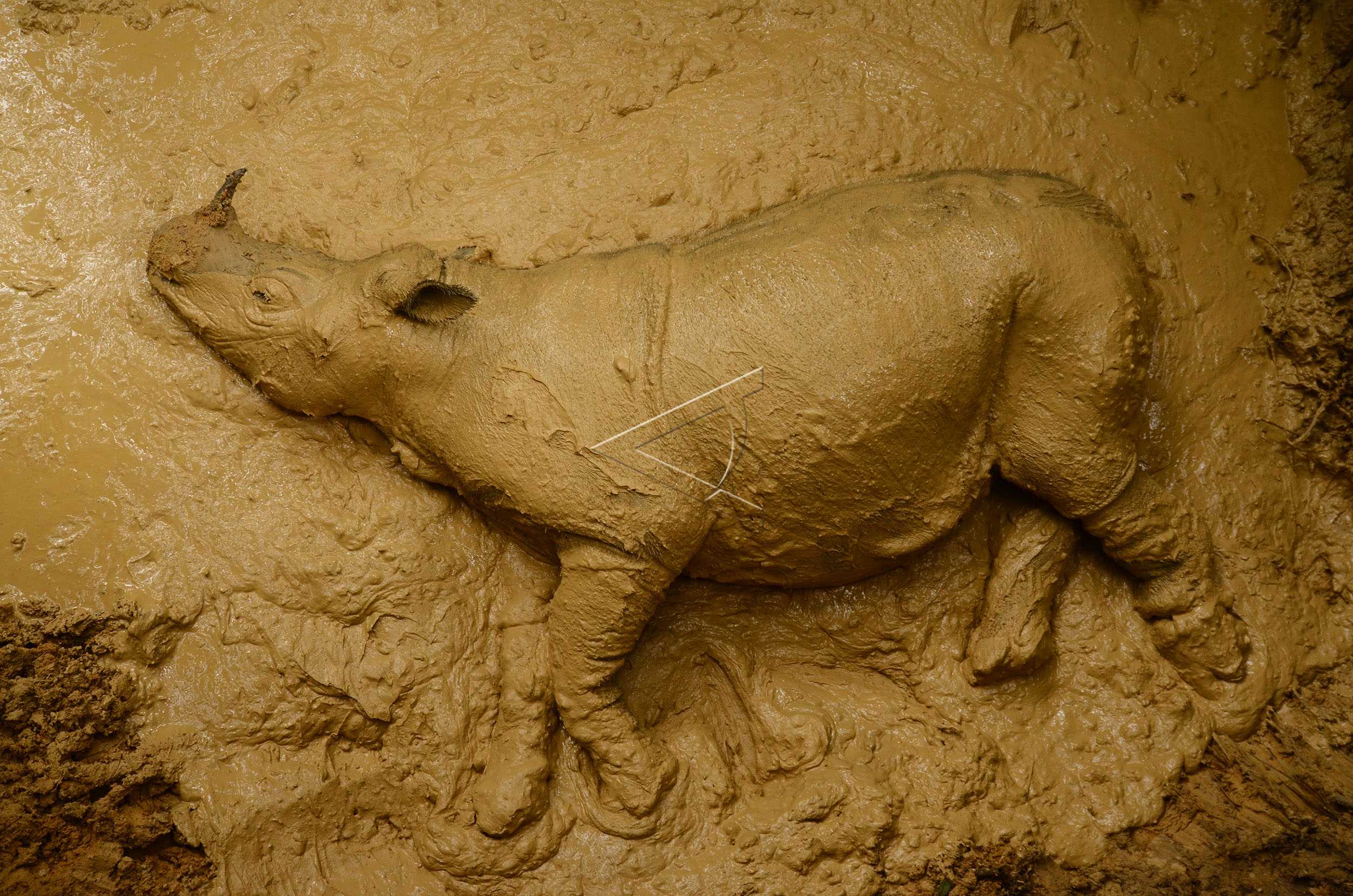 Female Sumatran rhino (Dicerorhinus sumatrensis) which just be found by WWF Indonesia team, Rhino Rescue Task Force and community in a forest of West Kutai, East Kalimantan on March 12, 2016, is seen playing in a mud inside a temporary cage in West Kutai, East Kalimantan, March 16, 2016. ANTARA FOTO/Sugeng Hendratno/dw/tom.
