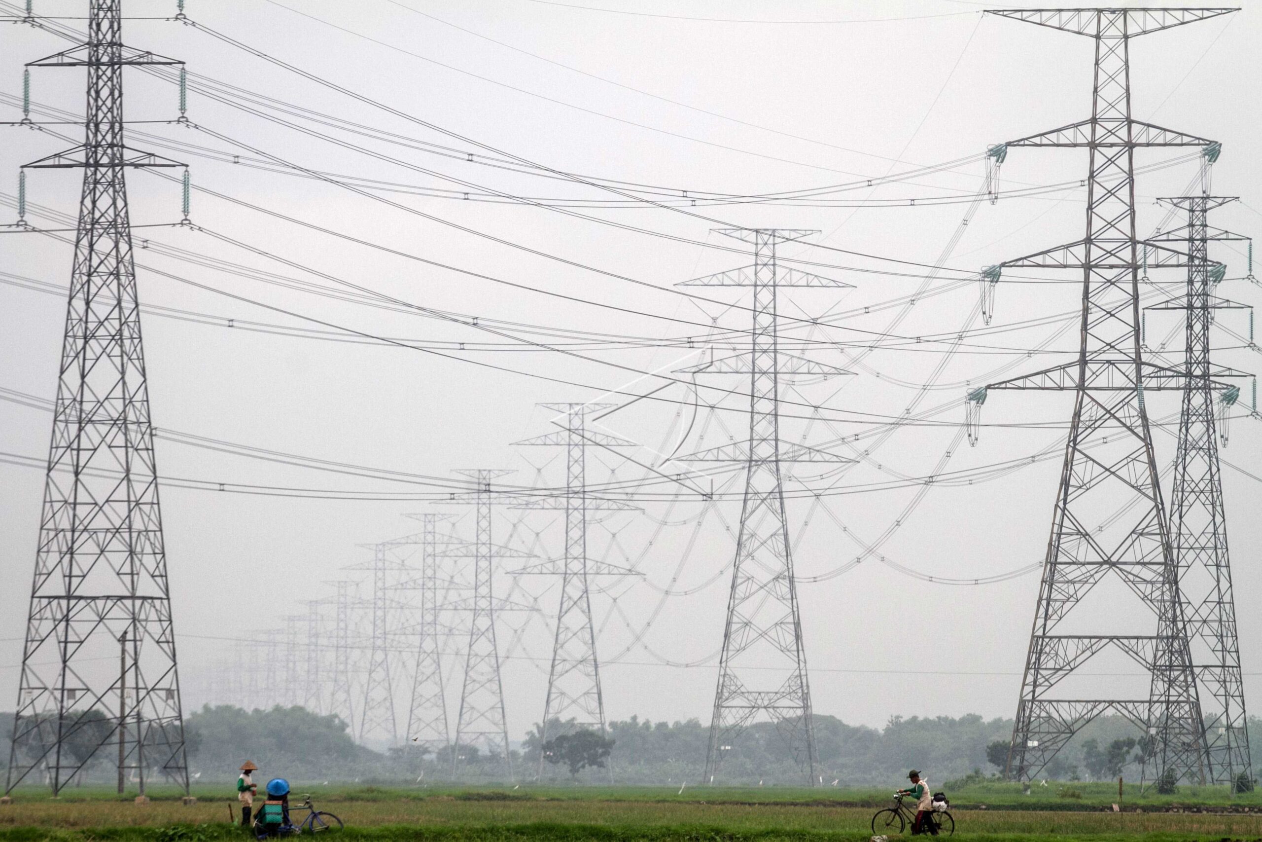 A number of farmers work on paddy fields with the background of Overhead Power Line (SUTET) tower at Tawang Sari in Sukoharjo, Central Java, December 1, 2017. ANTARA FOTO/Mohammad Ayudha/dw/pras.
