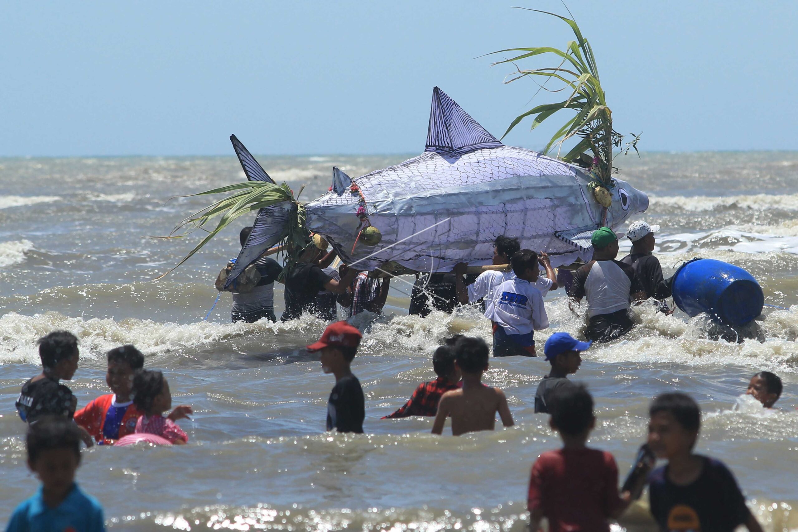 Residents bring fish replica to be thrown into the sea during “Syukur Pesisir” in Karangsong, Indramayu, West Java, September 16, 2018. ANTARA FOTO/Dedhez Anggara/kye/dw/wpa.