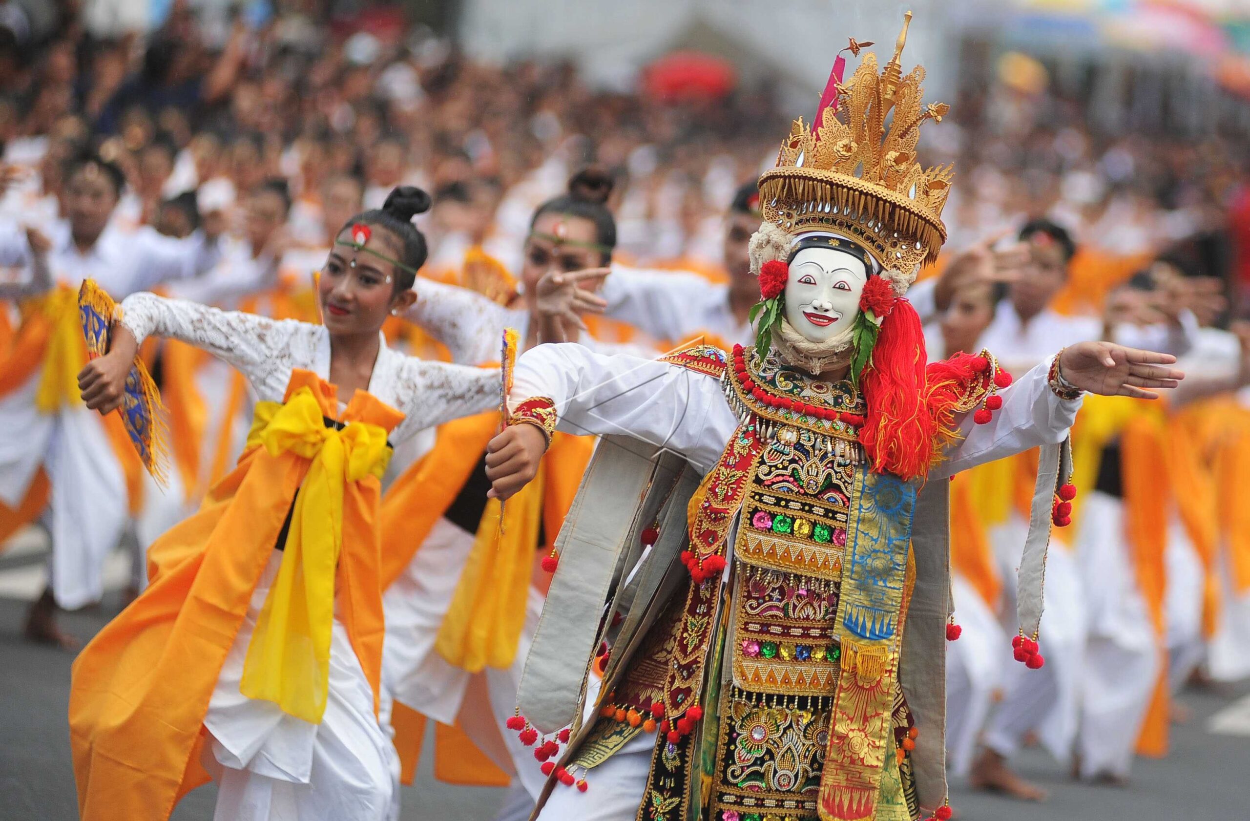Dancers perform a mass Telek Dance typical of Jumpai Village during the 2019 Semarapura Festival which is a series commemorations of the 111th Puputan Klungkung Day and the 27nd Anniversary of Semarapura City in Catur Muka, Semarapura, Klungkung, Bali, April 28, 2019.ANTARA FOTO/Fikri Yusuf/aww/dw/nym