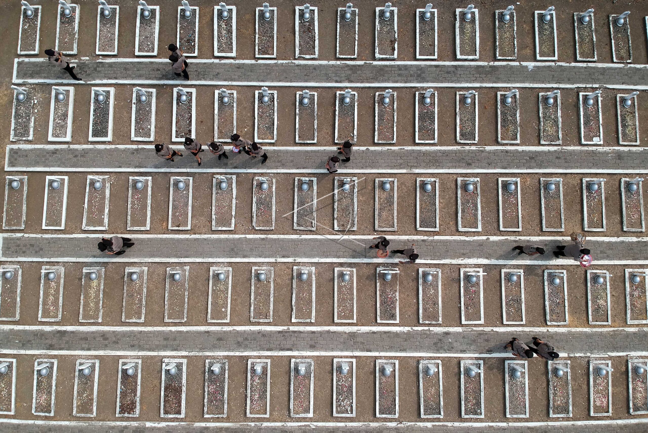 An aerial view shows Policewoman (Polwan) sowing flowers to commemorate the 71st Anniversary of Policewomen at the Heroes Cemetery of Pura Kusuma Negara, Tegal, Central Java, August 29, 2019. ANTARA FOTO/Oky Lukmansyah/ama/dw/nym.