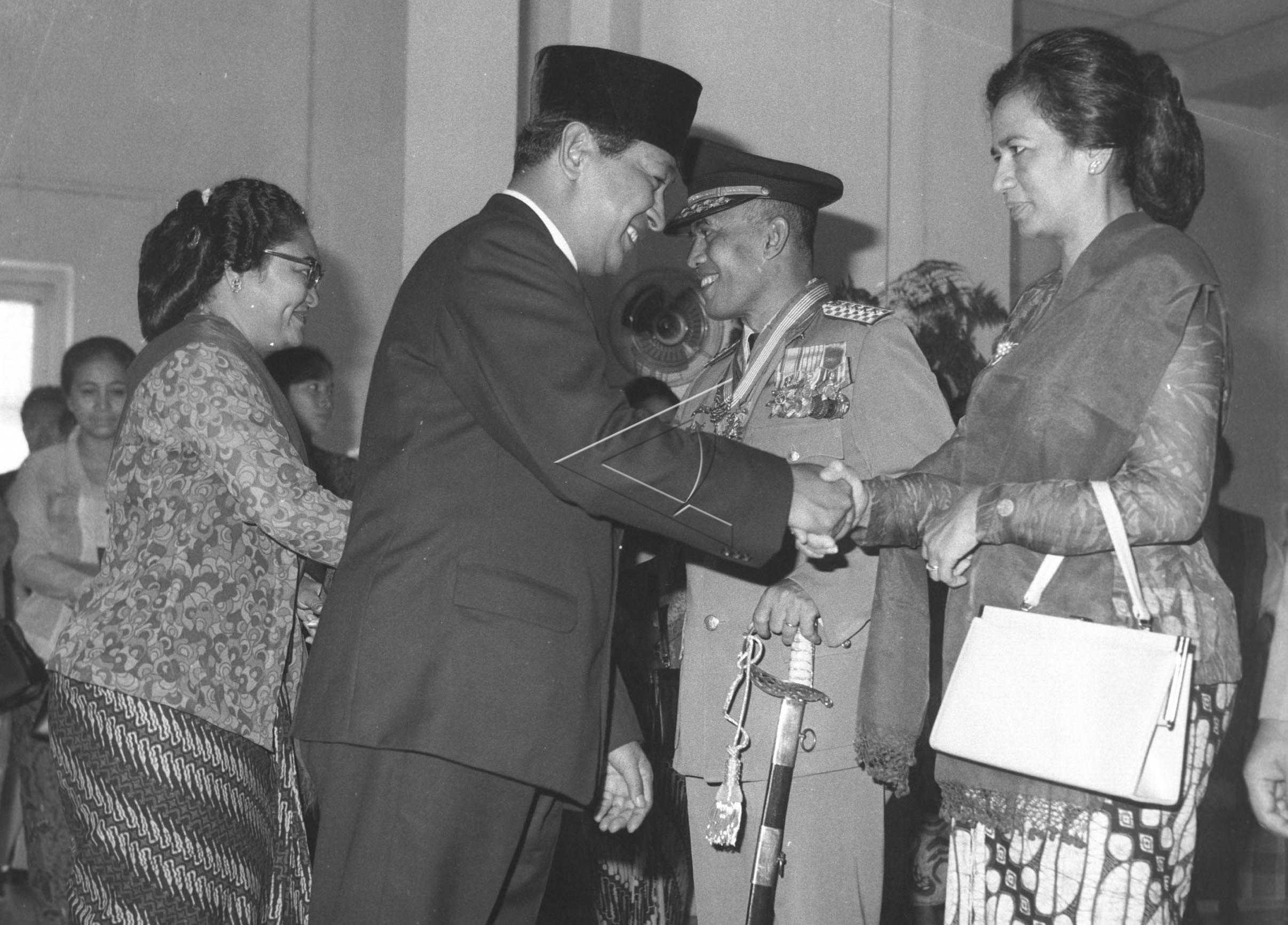 President Soeharto (second left) together with First Lady Mrs. Tien Soeharto (left) congratulates TNI General Abdul Haris Nasution (second right), January 15, 1969. ANTARA FOTO/IPPHOS/asf/pras/sa.