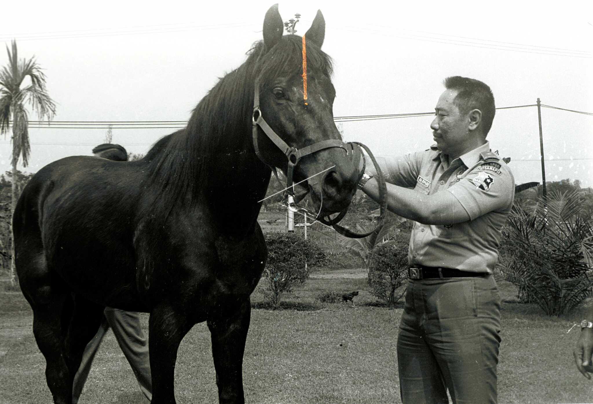Director of Samapta Polri, Brigadier General Pol. H. Hadiman holding a “Bestowed” stallion from Australia which was awarded by President Soeharto at Subdit Satwa Kelapa Dua Bogor, June 23, 1989. ANTARA FOTO/H04X/H05/asf/yu/sa.