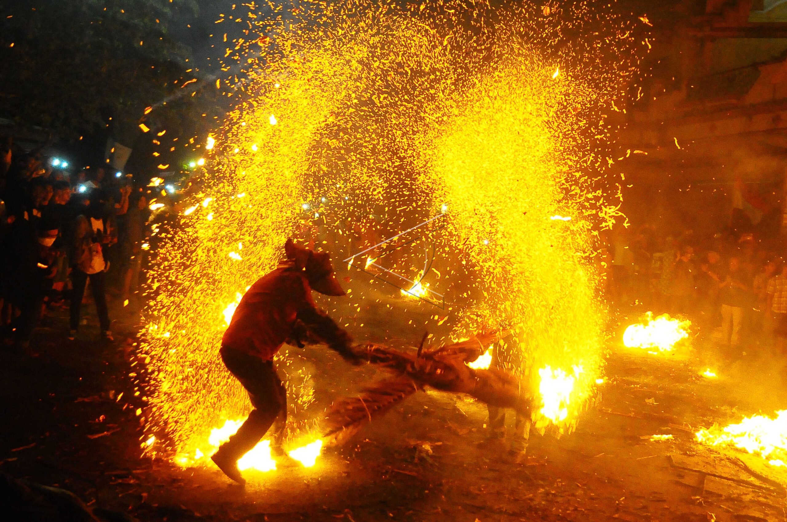 Participants attack each other with the torch during the torch war tradition meaning gratitude to God for the harvest, abundant earnings, and safety at Tegal Sambi Village, Tahunan, Jepara, Central Java, May 2, 2016. ANTARA FOTO/Yusuf Nugroho/ama/dw/nym.