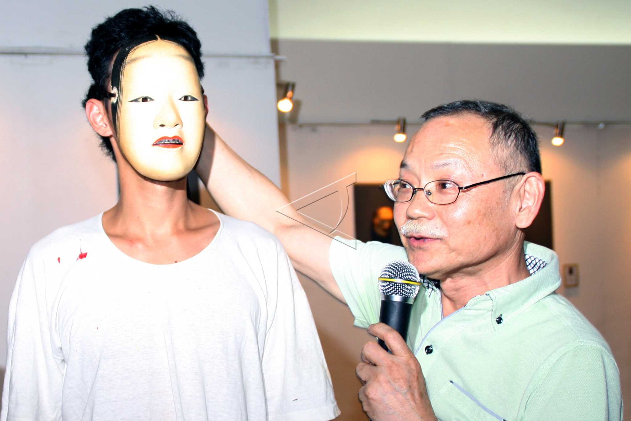Prof. Yasushi Mizutani (R) show a mask during a workshop exhibition on “Topeng Noh Japan”, a collaboration of Indonesia-Japan at Maranatha Gallery in Bandung, September 4, 2013. ANTARA FOTO/Agus Bebeng/spt/dw/nym