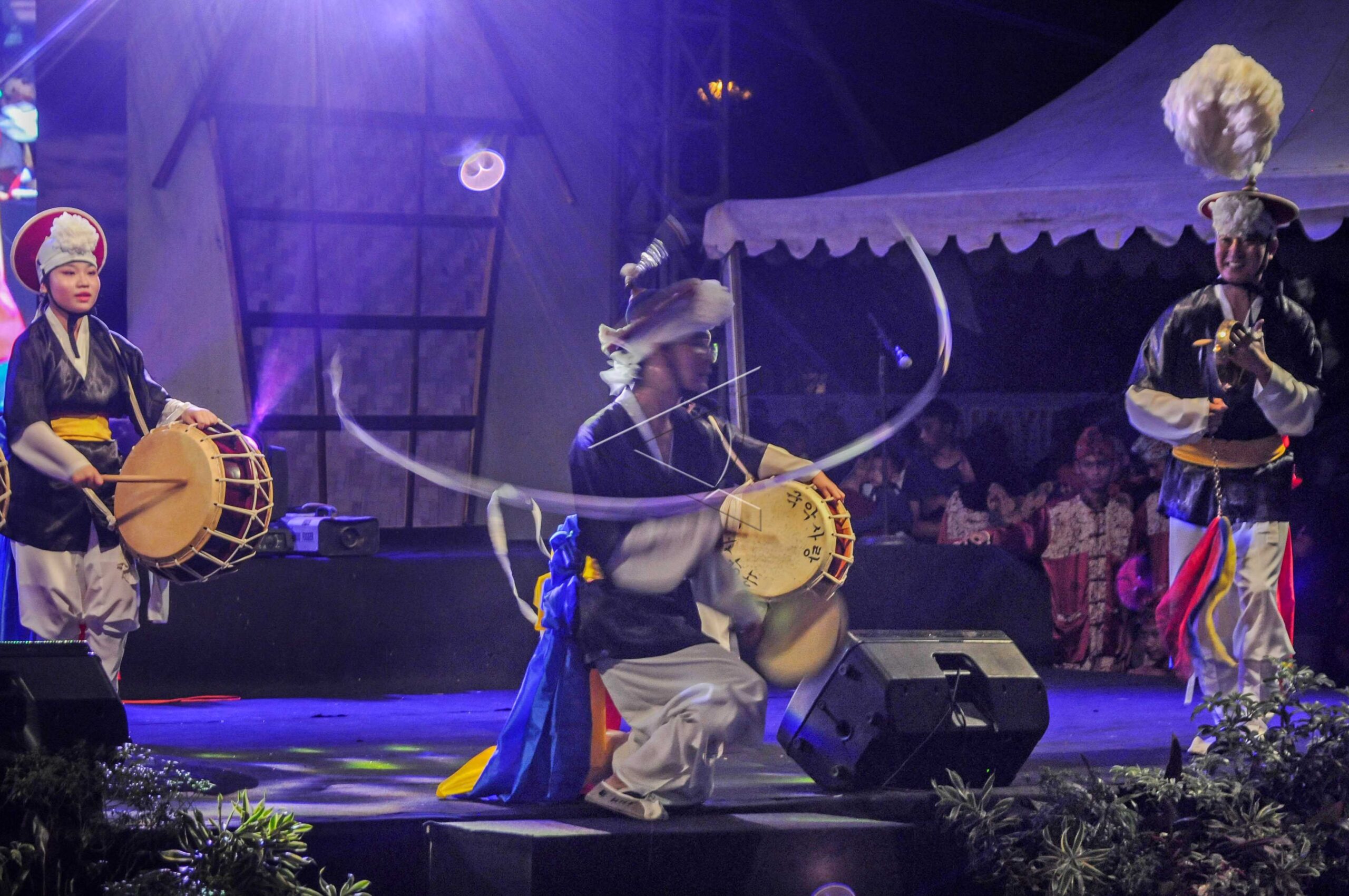 Dancers from South Korea performed the Samulnori Dance in the Cross-Cultural Arts Festival at Rangkasbitung Square, Lebak, Banten, December 6, 2019. ANTARA FOTO/Muhammad Bagus Khoirunas/hp/dw/nym.