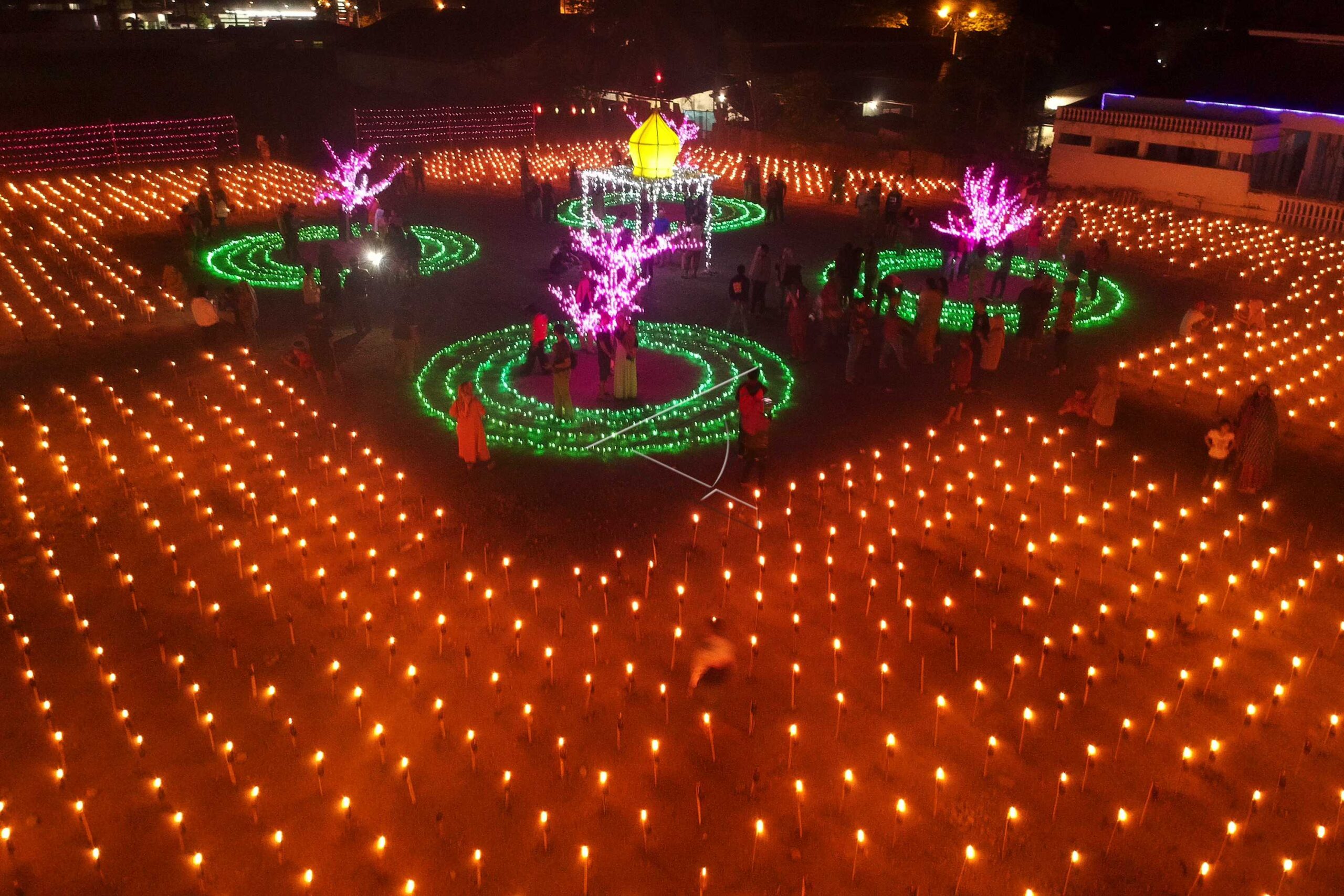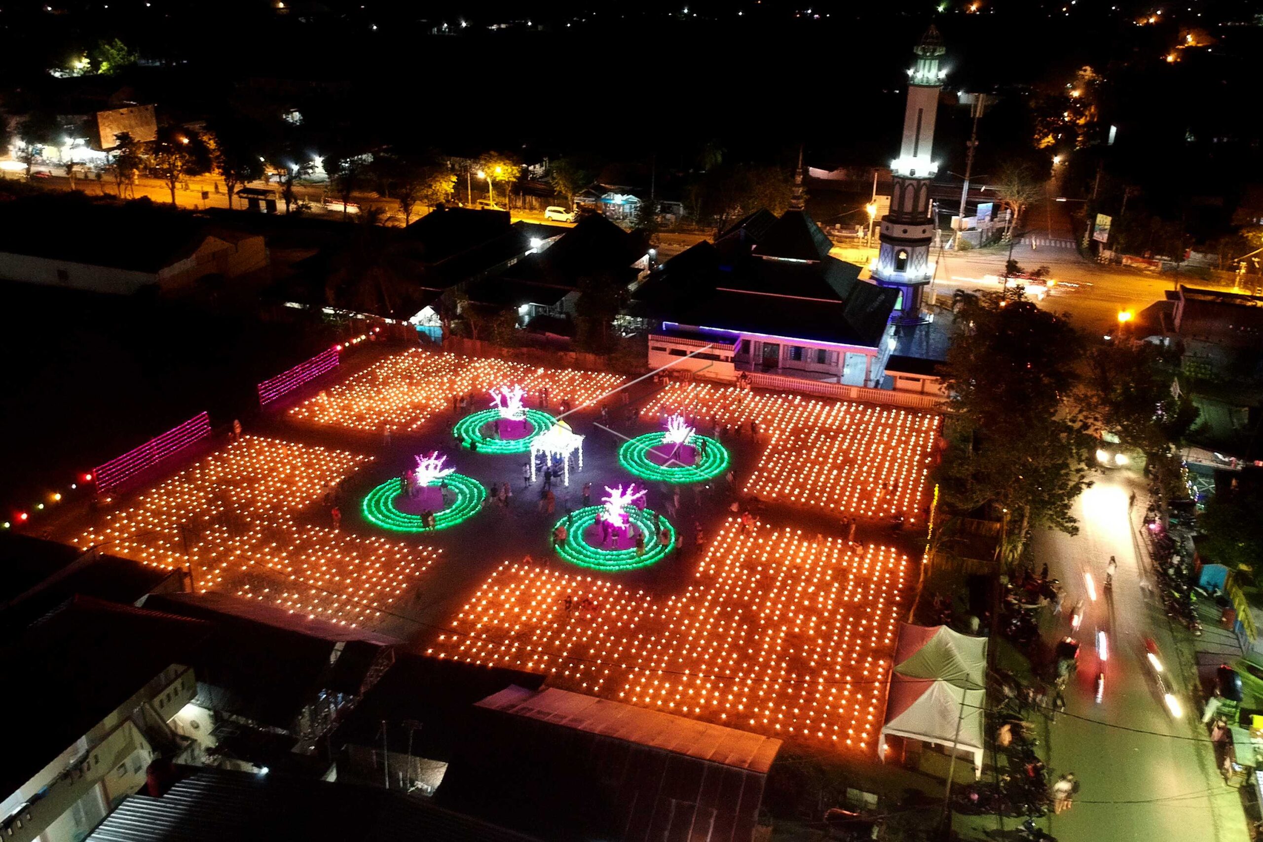 An aerial view of bottle lights that adorn one of the locations for the Tumbilotohe tradition celebration or the night of installing lights before Eid al-Fitr in Gorontalo City, Gorontalo, June 1, 2019. ANTARA FOTO/Adiwinata Solihin/hp/dw/nym