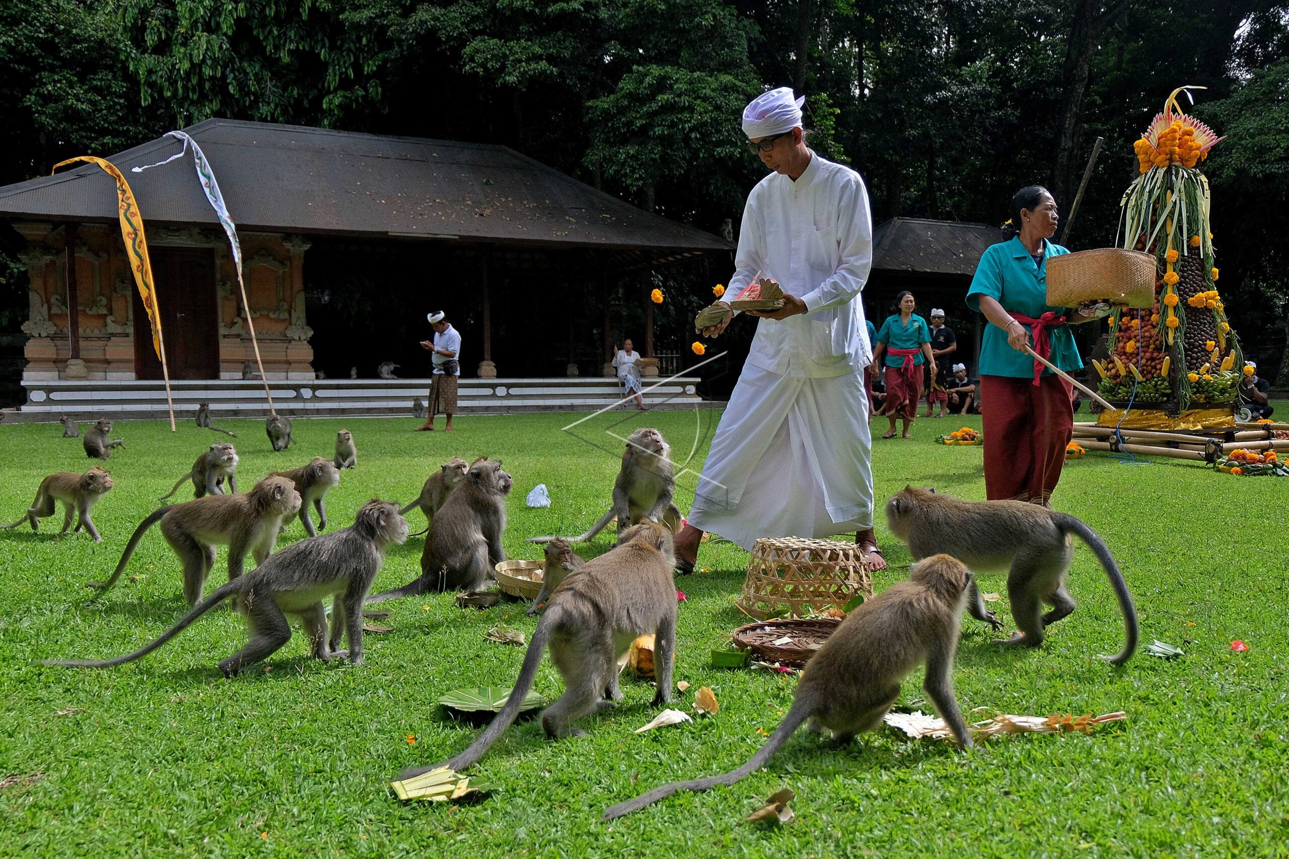 Hindu religious leader gives fruits to monkeys during “Tumpek Kandang” ceremony at Alas Kedaton tourism attraction in Tabanan, Bali, March 16, 2019. ANTARA FOTO/Nyoman Hendra Wibowo/dw/tom.