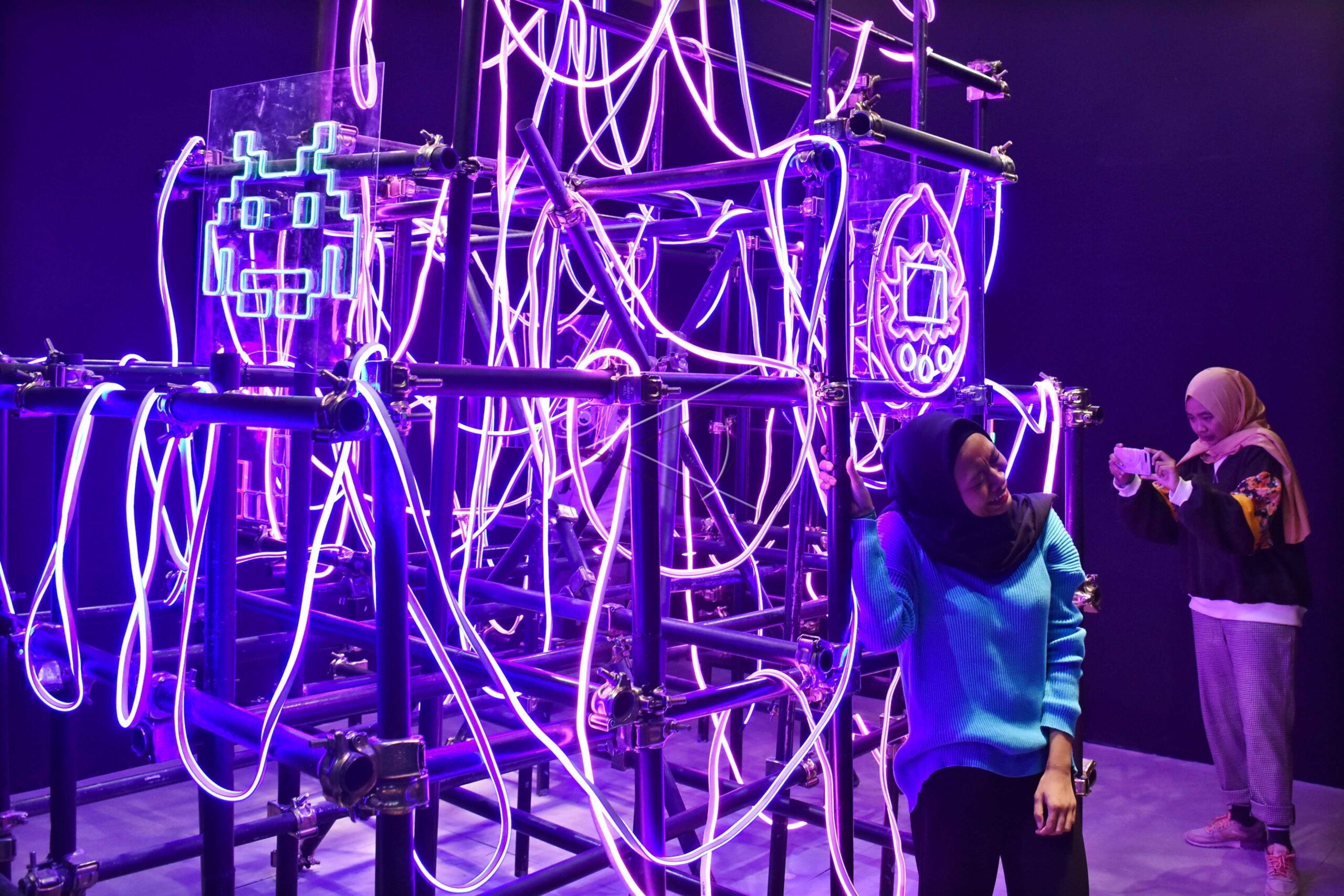 Visitors take pictures on one of the art installations at USS Arcade photo spots in Senayan City Mall, Jakarta, on April 11, 2019. ANTARA FOTO/Aditya Pradana Putra/dw/tom.
