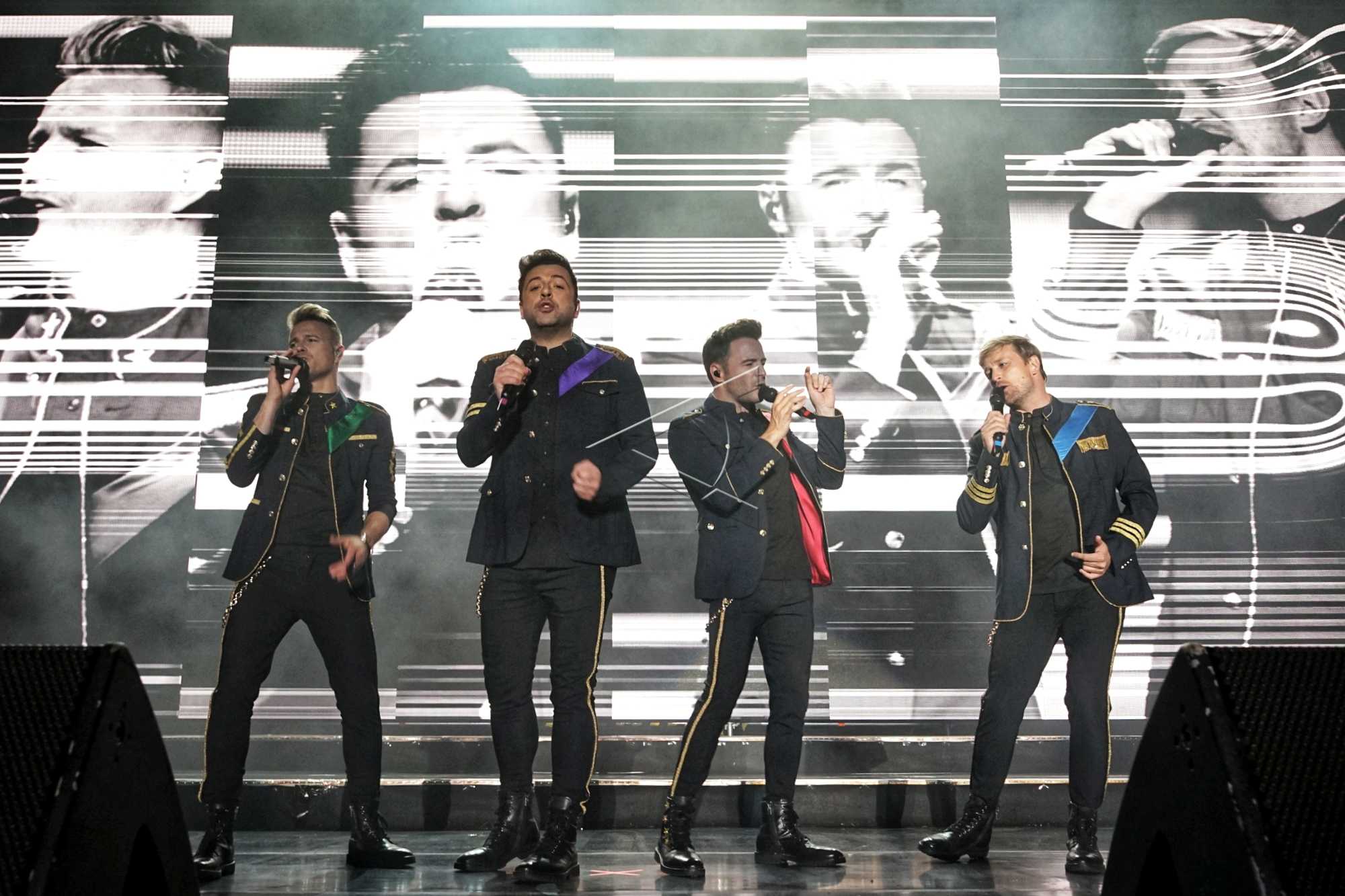 Legendary Irish boy band personnel, Westlife Shane Filan (second right), Kian Egan (right), Nicky Byrne (left) and Mark Feehily (second left) perform during the Borobudur Symphony 2019 event at Borobudur Temple Complex, Magelang, Central Java, August 31, 2019. ANTARA FOTO/Andreas Fitri Atmoko/hp/dw/sa.