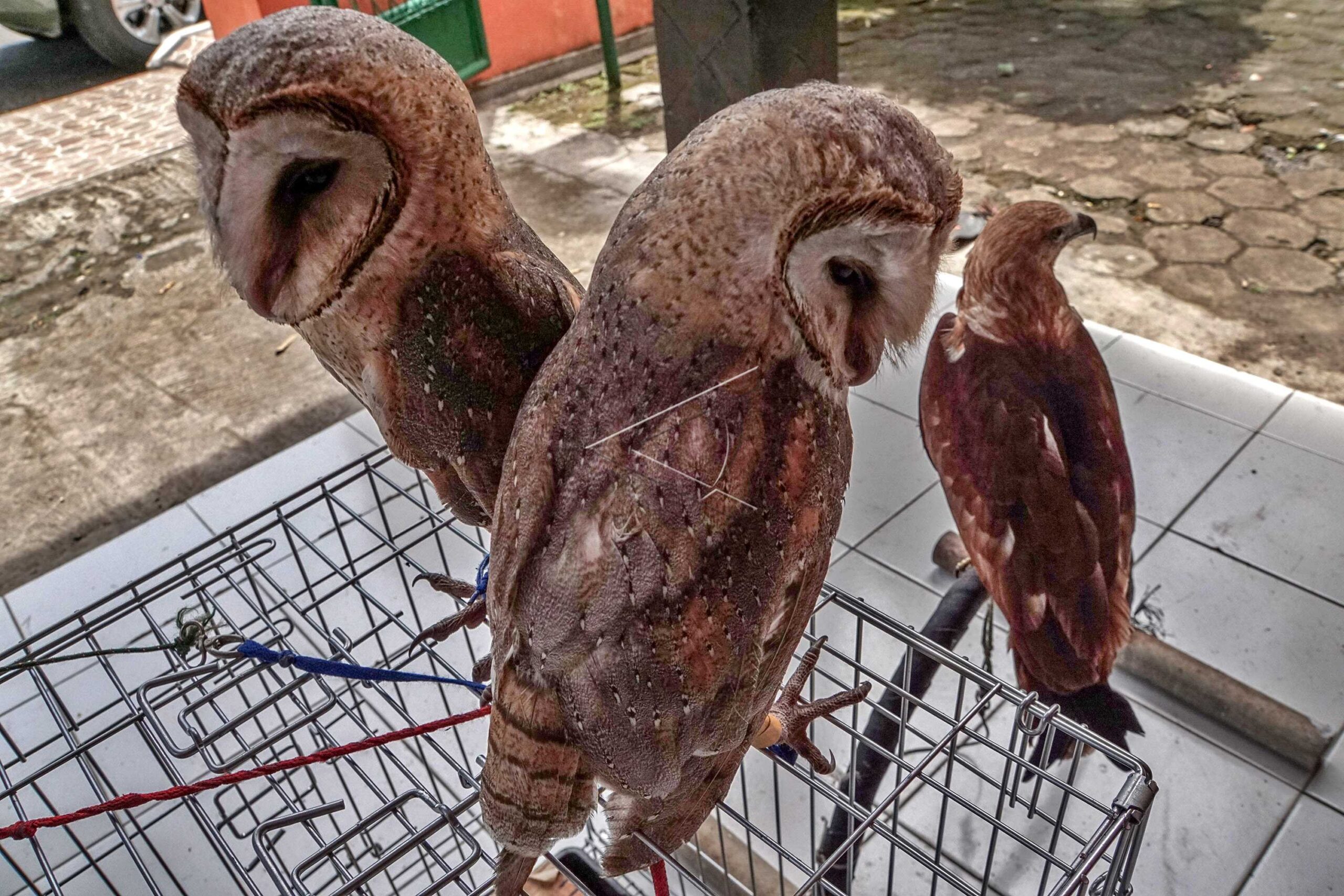 Brahminy kite (Haliastur indus) and two owls (Tyto alba) which seized during animal illegal trading operation are being kept at Natural Resources Conservation Center in Cilacap, Central Java January 27 2017. ANTARA FOTO/Idhad Zakaria/dw/tom.