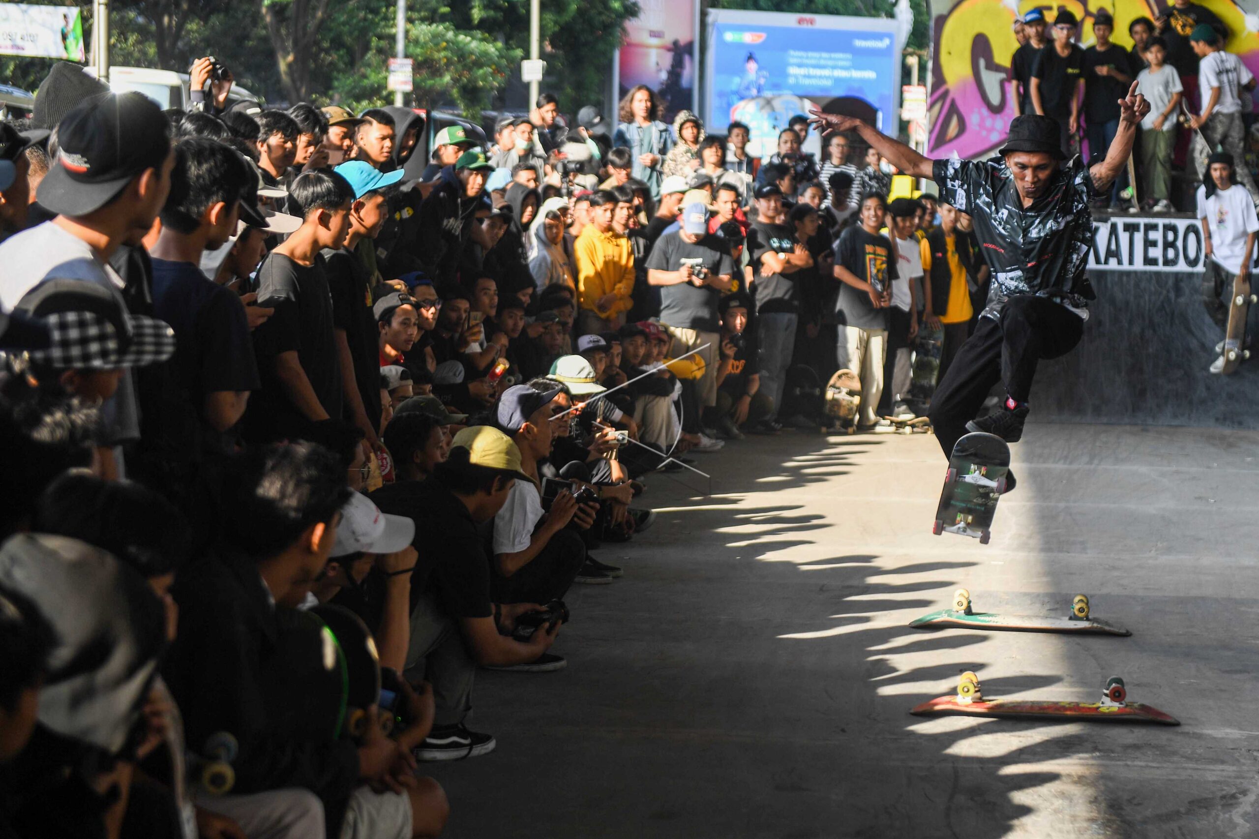 Hundreds of young skateboard lovers saw skater attraction to enliven the World Skateboarding Day 2019 themed “Bandung Go Skateboarding Day” at Skate Park Pasupati, Bandung, West Java, June 21, 2019. ANTARA FOTO/M Agung Rajasa/hp/dw/nym/sa.