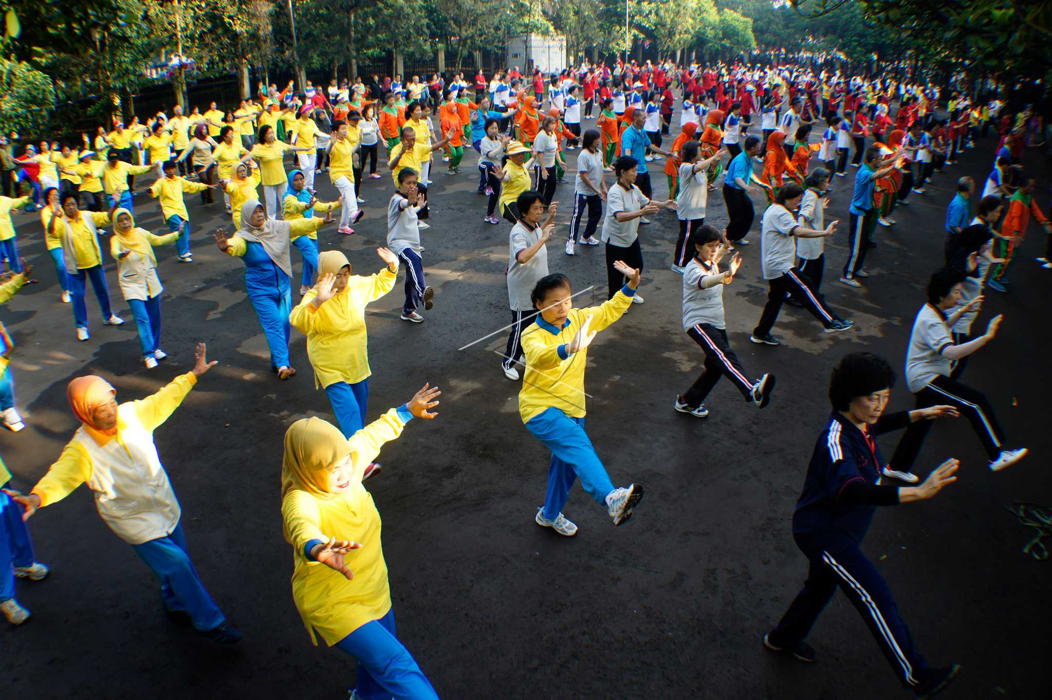 Several seniors take part in the World Taichi and Qigong Day event which is held every last Saturday in April and currently themed “One World, one Breath” at Tegalega square in Bandung, West Java, April 30, 2016. ANTARA FOTO/Agus Bebeng/pd/dw/nym/sa.