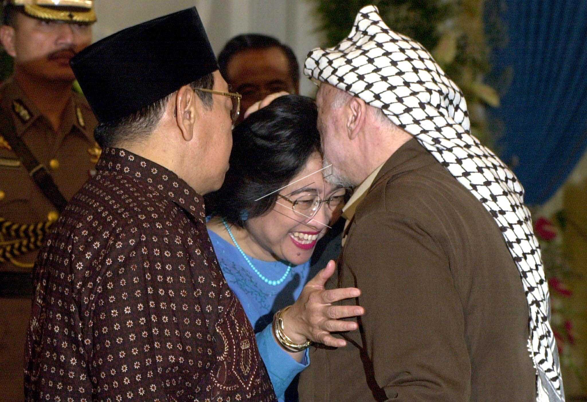 President of Palestine Yasser Arafat kisses Vice President Megawati Soekarnoputri’s forehead while President of Indonesia Abdurrahman Wahid looks on when he was arriving at the State Palace in Jakarta, August 16, 2002. ANTARA FOTO/Audy Mirza Alwi/hp/asf/pras.