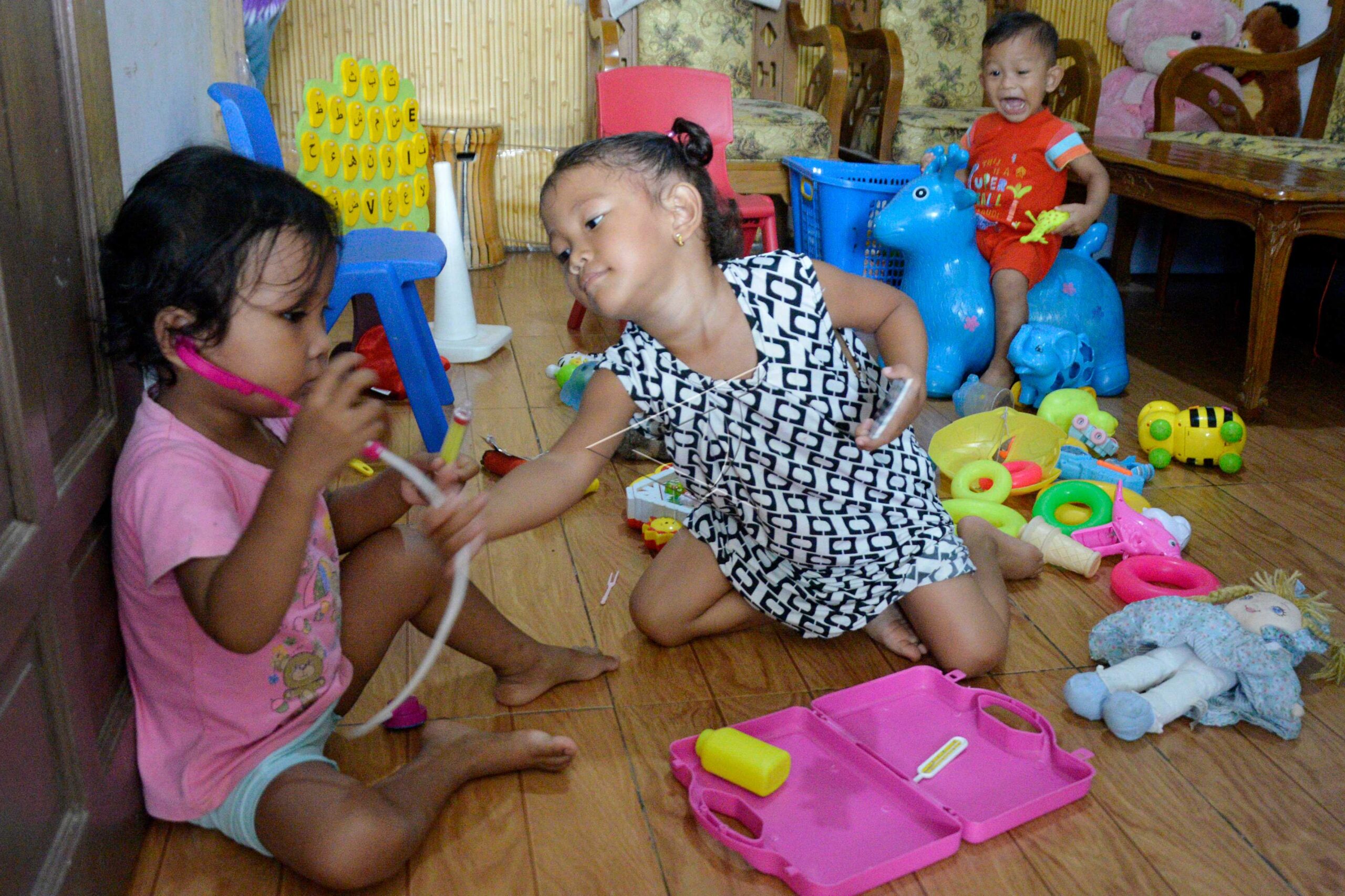 Anak-anak bermain di dalam rumah di Kompleks Perumahan Mawang, Kabupaten Gowa, Sulawesi Selatan, Minggu (29/3/2020). Aktivitas bermain di dalam rumah saat ini menjadi alternatif warga dalam mengurangi interaksi sosial sebagai upaya pencegahan penyebaran COVID-19. ANTARA FOTO/Abriawan Abhe/pras.