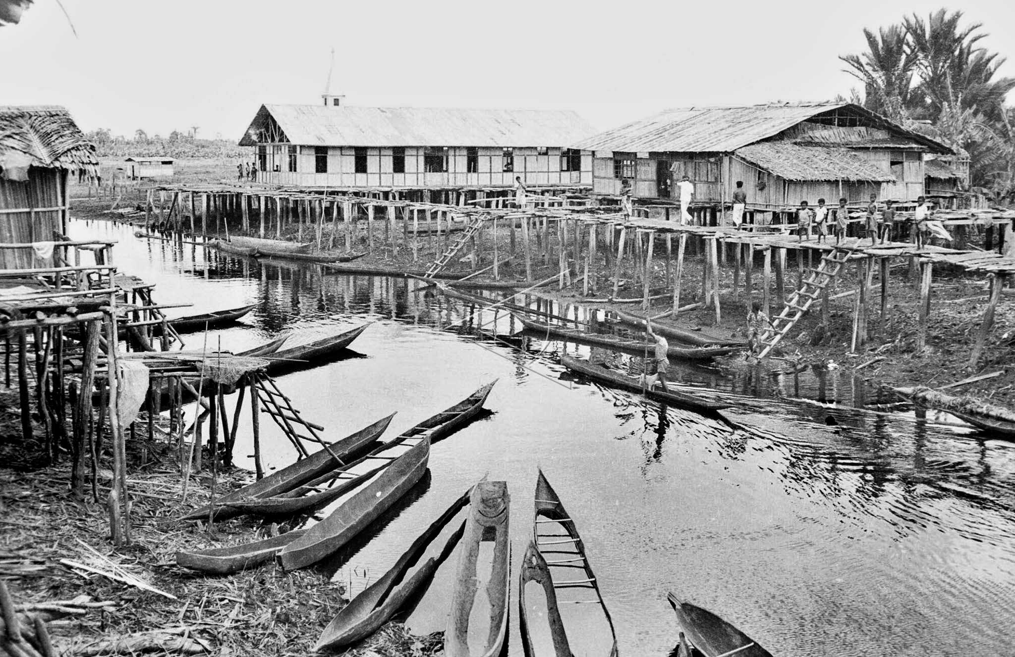 Warga berada di sekitar rumah panggung di tepi sungai yang juga digunakan sebagai sarana transportasi, mandi, cuci, dan kakus (MCK), di Kokoda, Inanwatan, Sorong, Irian Jaya (1993). ANTARA FOTO/J. Resalian/asf/tom.